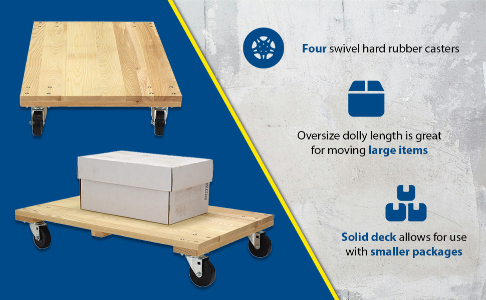 | Hardwood Solid Deck Dolly with Non Marking Casters 36 In. x 24 In. x 6-15/16 In. 1200 Lb. Capacity | Uniform Static Capacity (lb.): 1,200 Deck Width (in.): 24 | 35 |