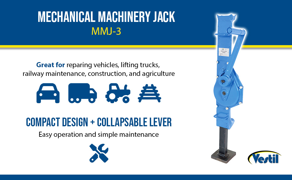 Mechanical Machinery Jacks are good for repairing vehicles, lifting trucks, railway maintenance, construction, mining, and agriculture. Compact design with collapsible lever offers easy operation and simple maintenance. A self locking, anti-kickback operating lever reduces injuries. Standard features include: folding handle, two carrying handles and a large base plate. Lifting and lowering speed is controllable. No seals to leak. Will not drift down even after an extended period of time.
