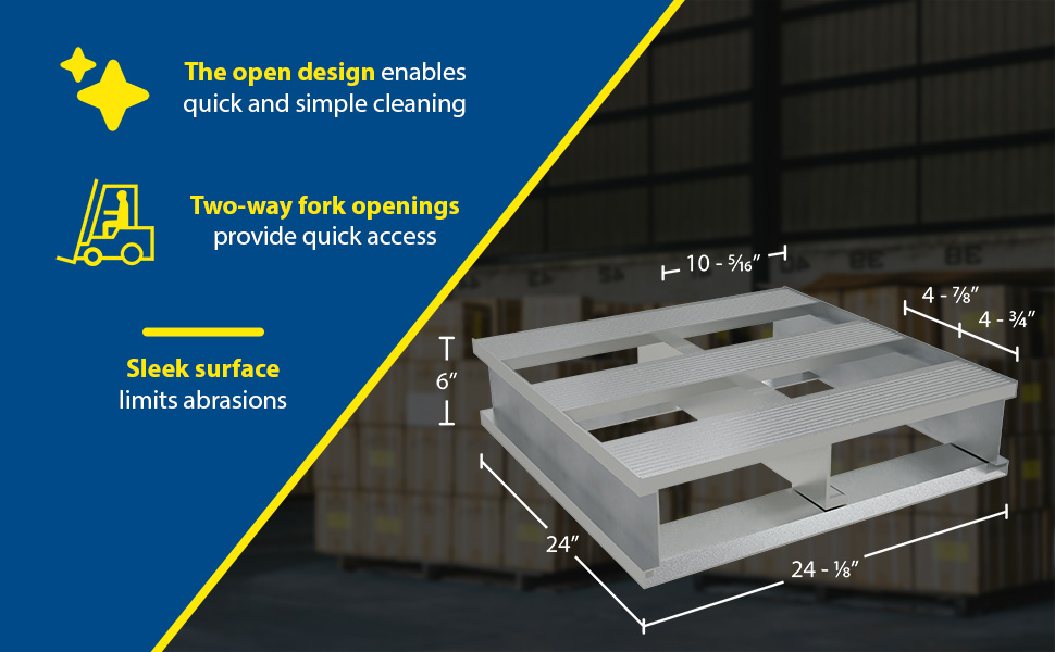 | Aluminum Heavy Duty Half Pallet 24 In. x 24 In. x 6 In. 4000 Lb. Capacity Silver | Uniform Capacity: 4000 Fork Pocket Width(in.): 22.5625 | 13 |