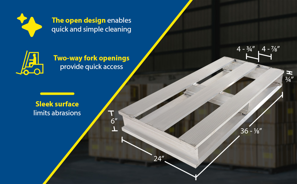 | Aluminum Heavy Duty Half Pallet 24 In. x 36 In. x 6 In. 4000 Lb. Capacity Silver | Uniform Capacity: 4000 Fork Pocket Width(in.): 8.3125 | 17 |