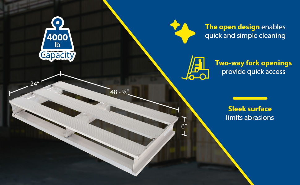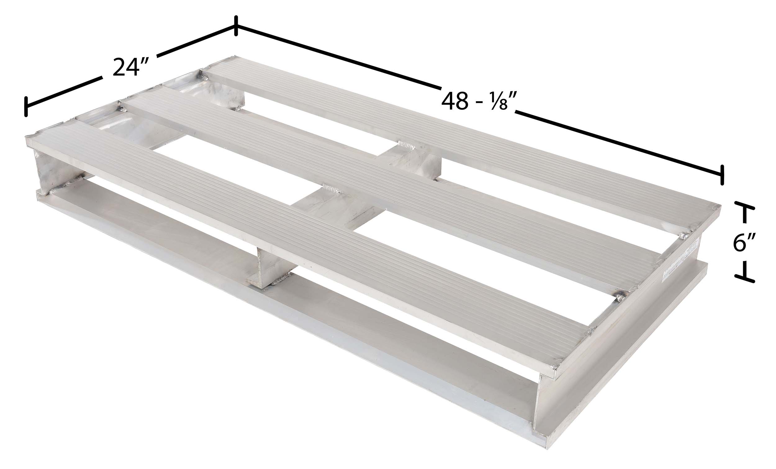 | Aluminum Heavy Duty Half Pallet 24 In. x 48 In. x 6 In. 4000 Lb. Capacity Silver | Uniform Capacity: 4000 Fork Pocket Width(in.): 22.5625 | 26 |