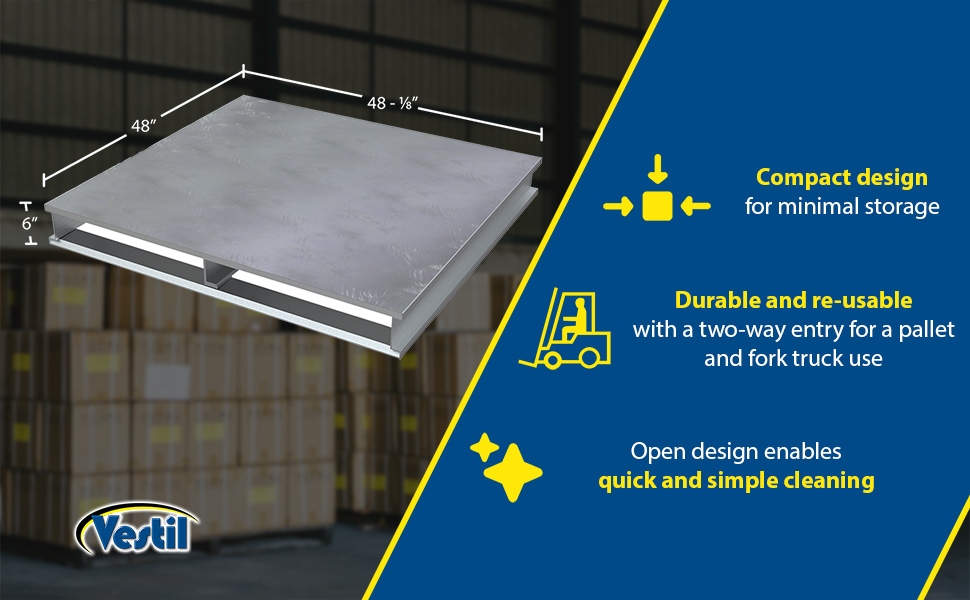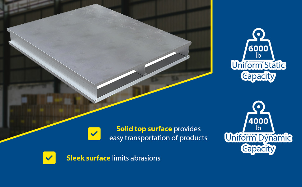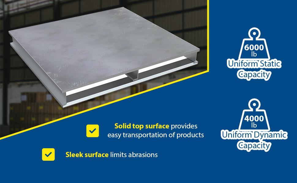 | Aluminum Heavy Duty Solid Top Pallet 48 In. x 48-1/8 In. x 6 In. 6000 Lb. Capacity Silver | Uniform Floor (static) Capacity (lb.): 6000 Uniform Fork (dynamic) Capacity (lb.): 4000 | 117 |