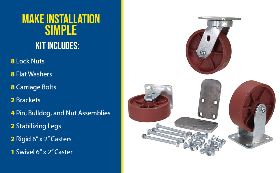 H-CK3-SC6-2HD H-CK3-SC6-2HDDuctile Steel Caster Kit 6 In. x 2 In. 6,000 Lb. Capacity MaroonUniform Capacity per caster (lb.): 6000