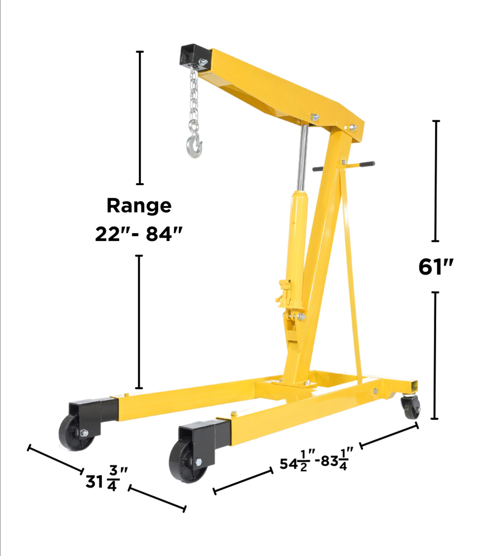 Steel Shop Crane Engine Hoist with Telescopic Legs 6000 Lb. Capacity YellowA portable shop crane engine hoist is great for hundreds of lifting applications. It features a telescopic boom, benefiting different lifting heights and capacities. Features a large diameter ram to withstand angled loads when lifting. Includes two (2) rigid and two (2) swivel casters for portability. Heavy-duty steel construction and painted finish.