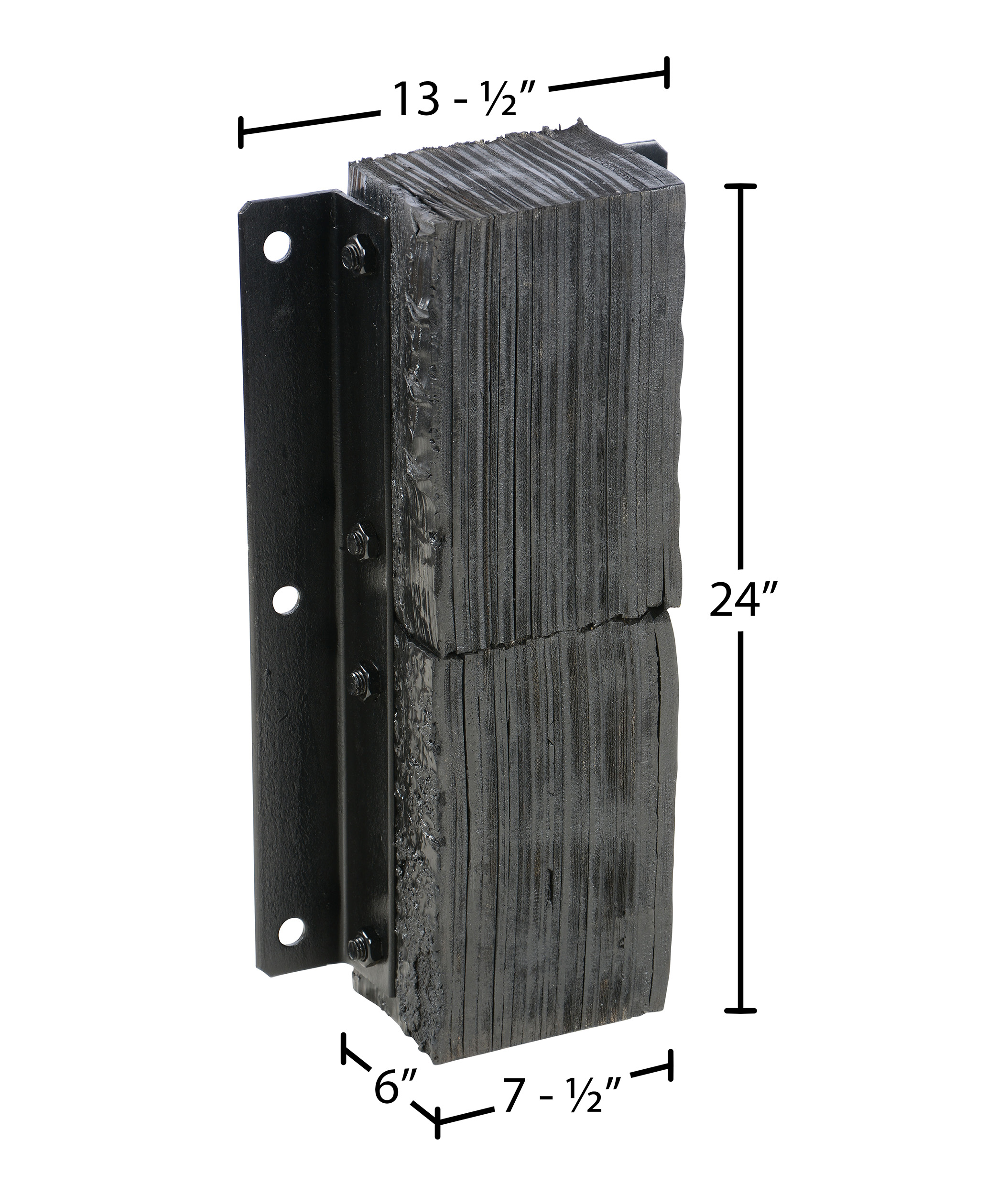 The laminated Dock Bumper provides durable, economical protection for loading docks and trailers. Unit is constructed of fabric reinforced rubber from recycled truck tires. The pads are laminated between painted structural angles and held together with steel tie rods. Installation is quick and easy by bolting or welding unit to the dock. Width is bolt hole center to bolt hole center. The installation hardware is available separately.