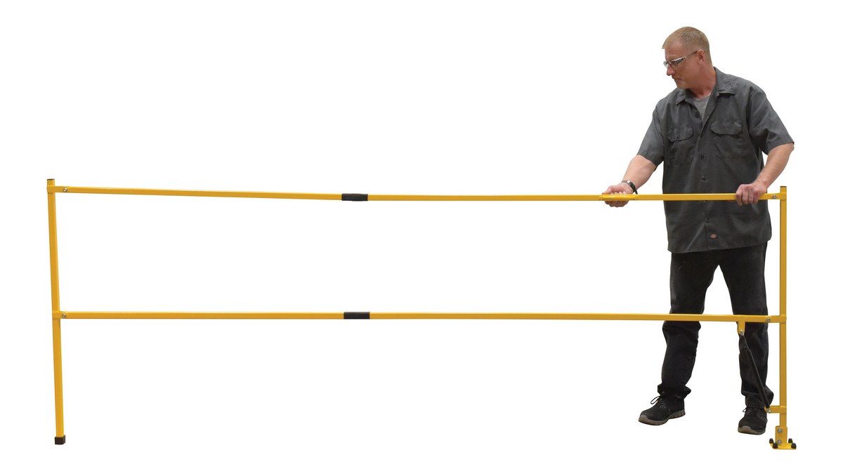 The Safety Lift Gate can be lifted out of the way with a single finger. Simply lift and the self folding action folds the gate in a vertical position. With the gas strut cylinder, the gate can be lifted with the slightest of effort. The Lift Gate is manufactured of steel tubing with a yellow baked-in powder-coat finish for added toughness. The unique design can be either wall or floor mounted. The Lift Gate is fantastic for mounting on loading dock doors to help reduce the possibility of people falling.