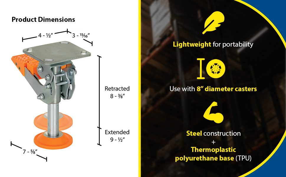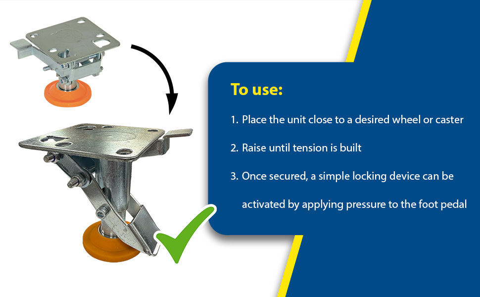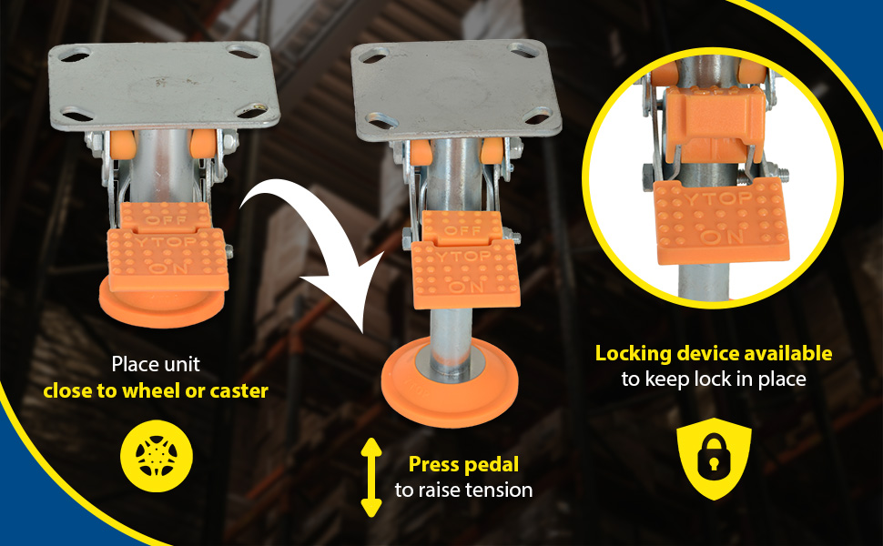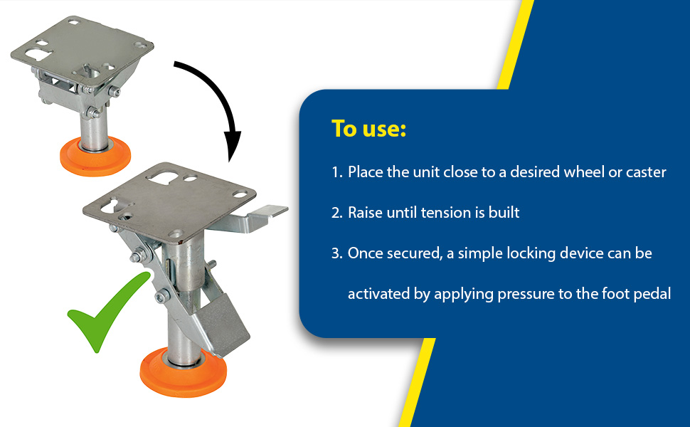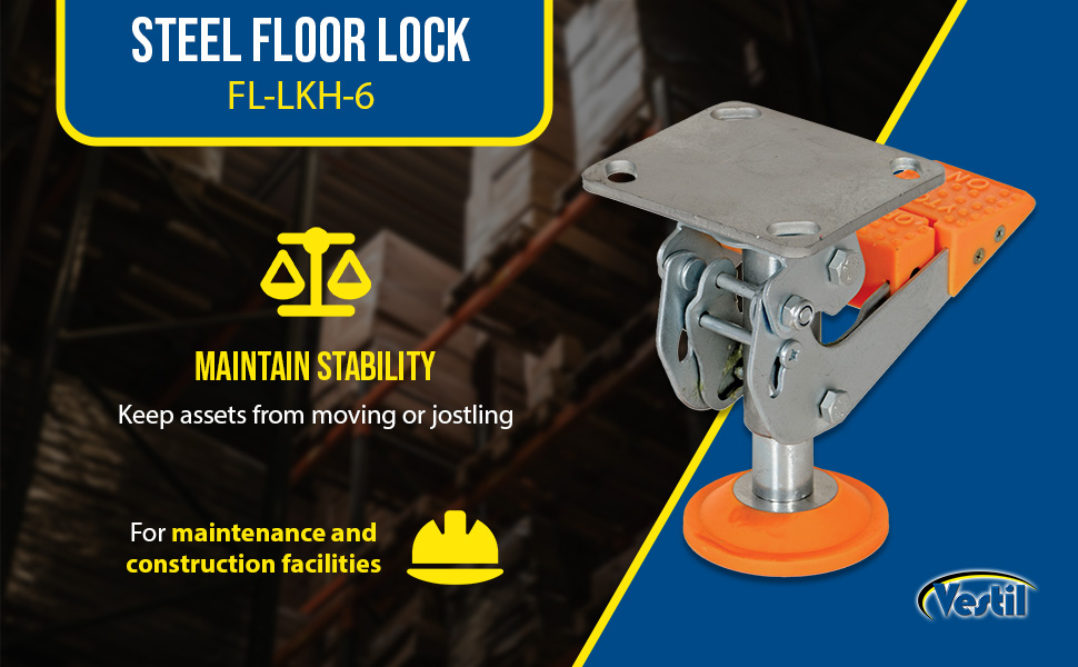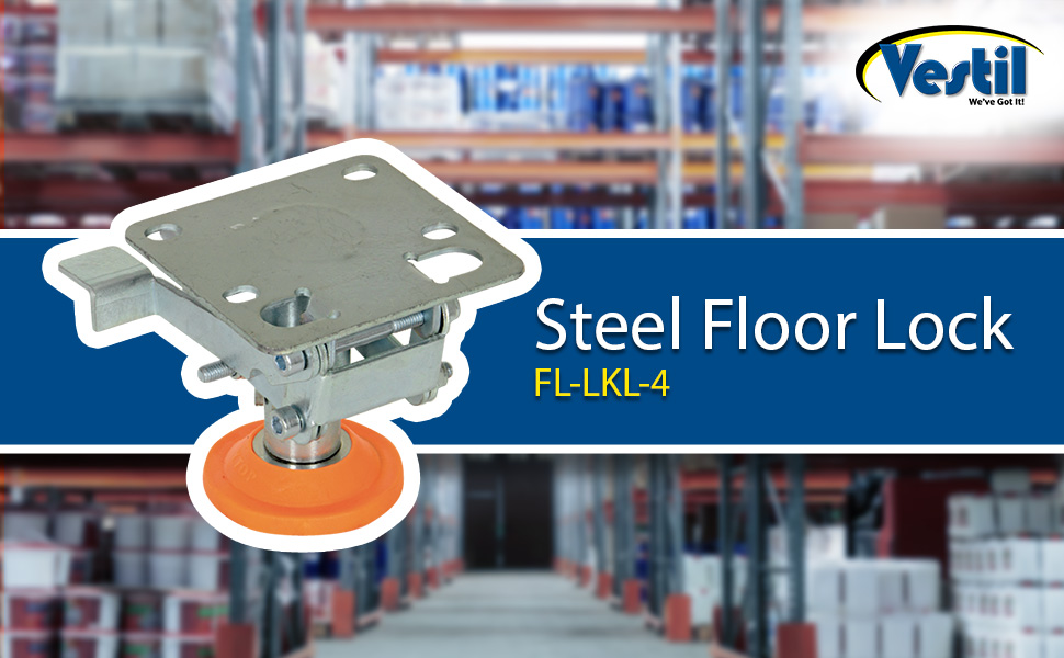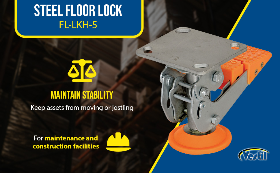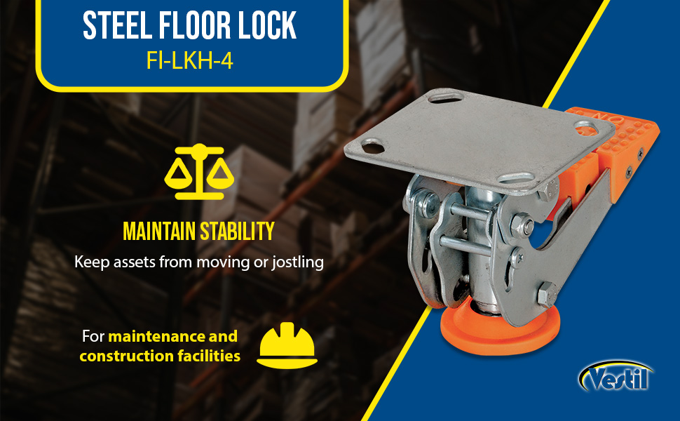 Floor Locks are ideal for maintenance and construction facilities. The unit is designed to create a stable environment, while decreasing the chance of jostling or slight movement. The unit is constructed of steel with a thermoplastic polyurethane base. To use, place the unit close to a desired wheel or caster and raise until tension is built. Once secured, a simple locking device can be activated by applying pressure to the foot pedal.