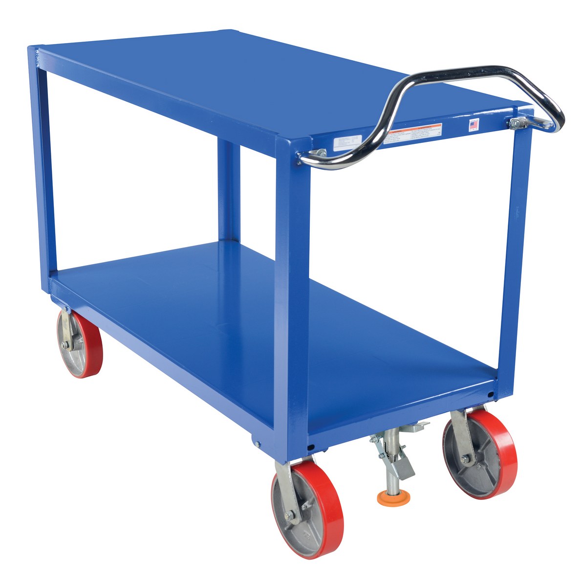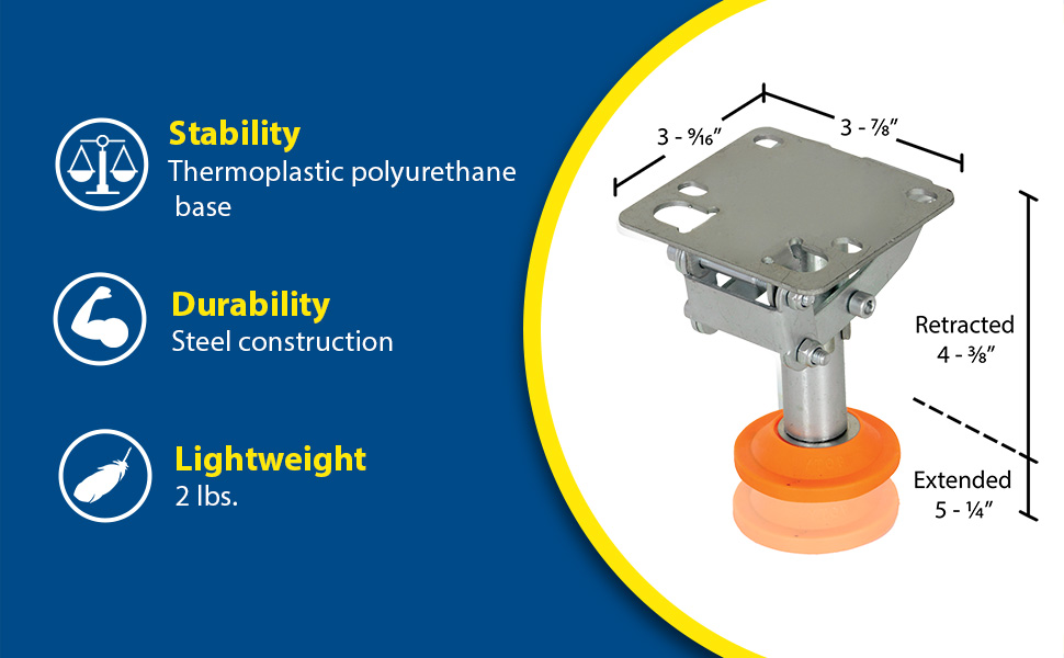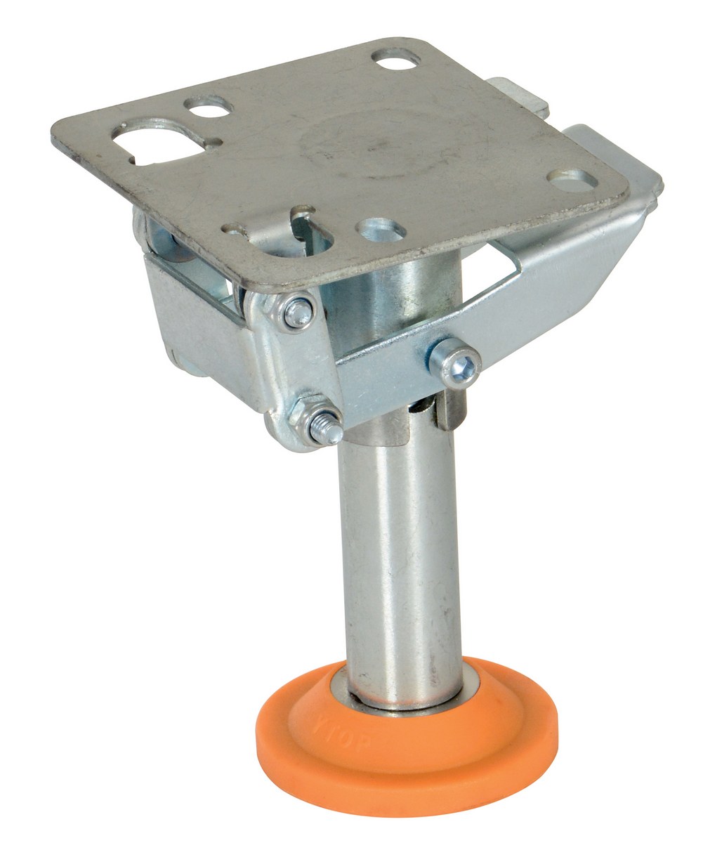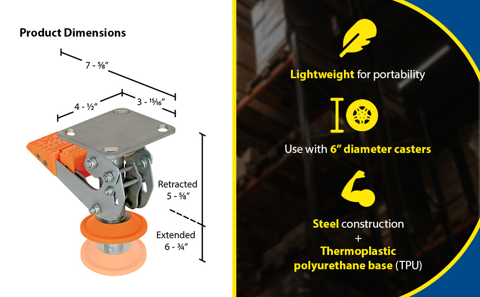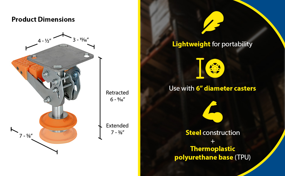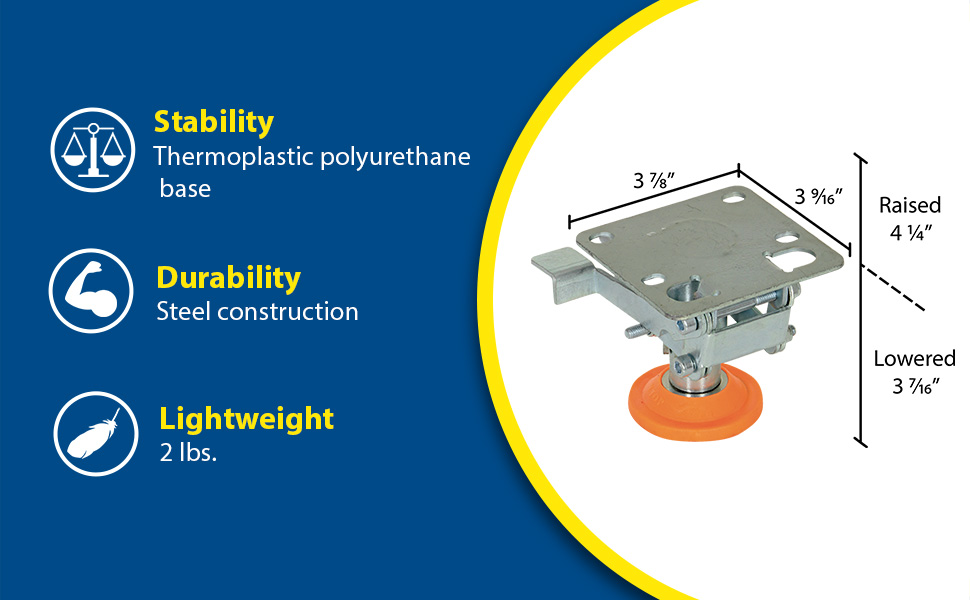 Floor Locks are ideal for maintenance and construction facilities. The unit is designed to create a stable environment, while decreasing the chance of jostling or slight movement. The unit is constructed of steel with a thermoplastic polyurethane base. To use, place the unit close to a desired wheel or caster and raise until tension is built. Once secured, a simple locking device can be activated by applying pressure to the foot pedal.