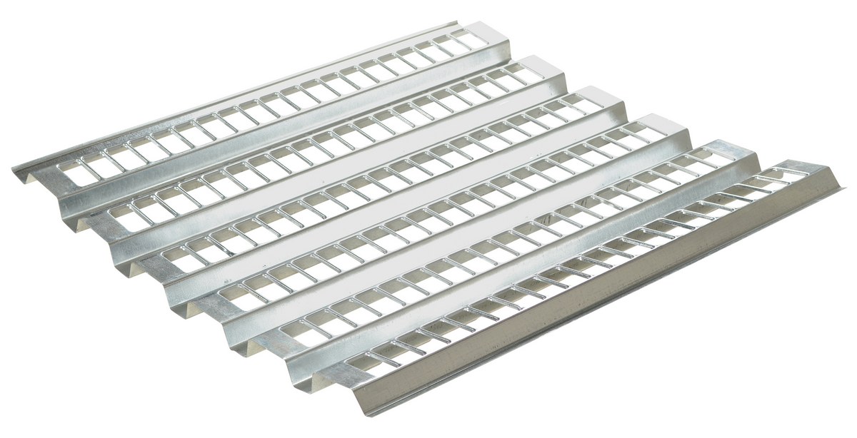 Ideal for storing furniture, carpet, record files or products that require a uniform support. Fire protection friendly with 50% open design. Designed for pallet rack beam with 42" deep racking. The bright galvanized finish makes the 22 gauge steel rack appear more industrial. Fits 1-1/2." beam offset. The top hats are 3-1/2" wide with top slotted holes 1-1/4" x 2-1/2" and the valleys are 2-1/2" wide with slotted holes 1" x 3". Custom sizes available, contact factory.