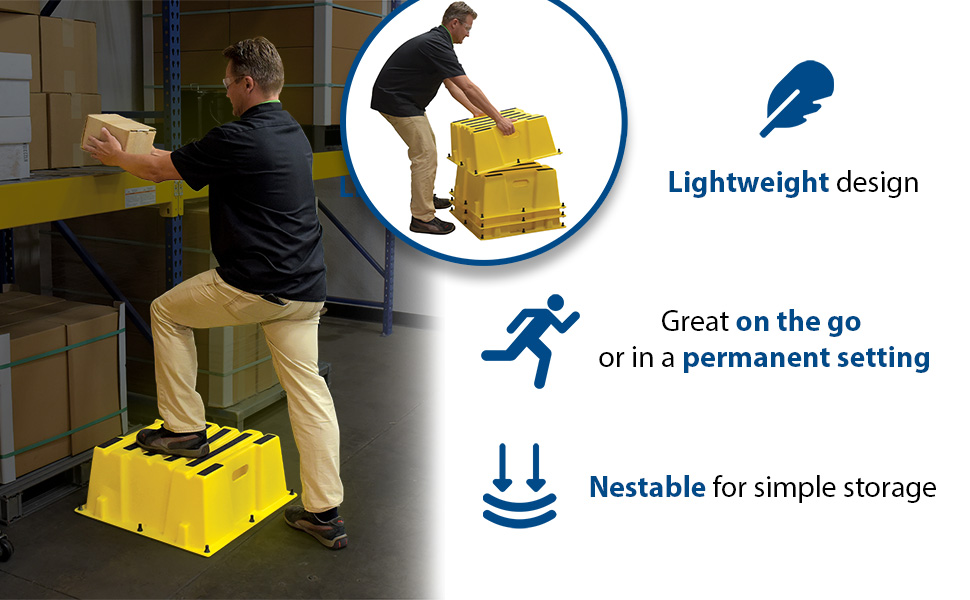 A poly step stool is a great asset for on the go or in a permanent setting. A lightweight design with front and side cutout handles, allow the user to easily transfer the stool to a preferred spot. The taped step surfaces ensure safe footing while traversing up and down the steps. Includes bolt on handrail and casters. The hand rails height allows the unit to be pushed or pulled into the desired position, minimizing bending and twisting by the user. Steps can be nested to minimize footprint when not in use.