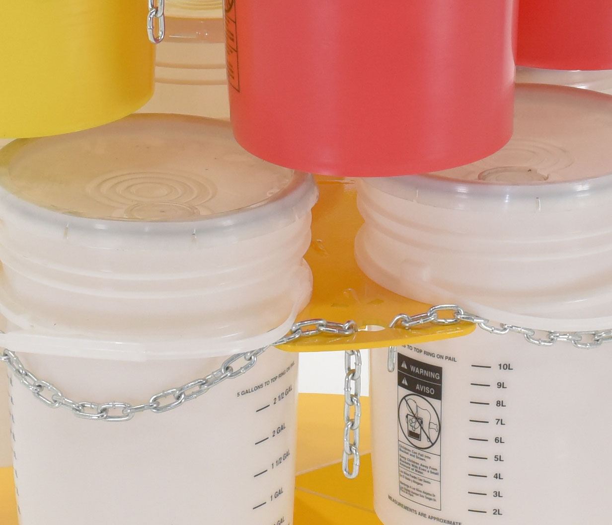 A Pail carousel rack is a quick way to transfer loaded and unloaded pails. Each bay is a perfect fit for a 5 gallon pail, while an included safety chain gives an extra level of security. The carousel design enables circular movement of each tier, allowing the user to maintain their position instead of moving to each individual pail bay. The rack is constructed of 1/4" thick powder coated steel.