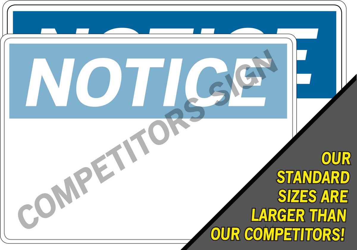 NOTICE SAFETY SIGNAGE OUR MOST POPULAR REQUESTED Signs! NOTICE Model Number Format: (sign #) - (size) - (material) Example: SI-N-01-A-AL-040 When ordering your signage follow these steps: