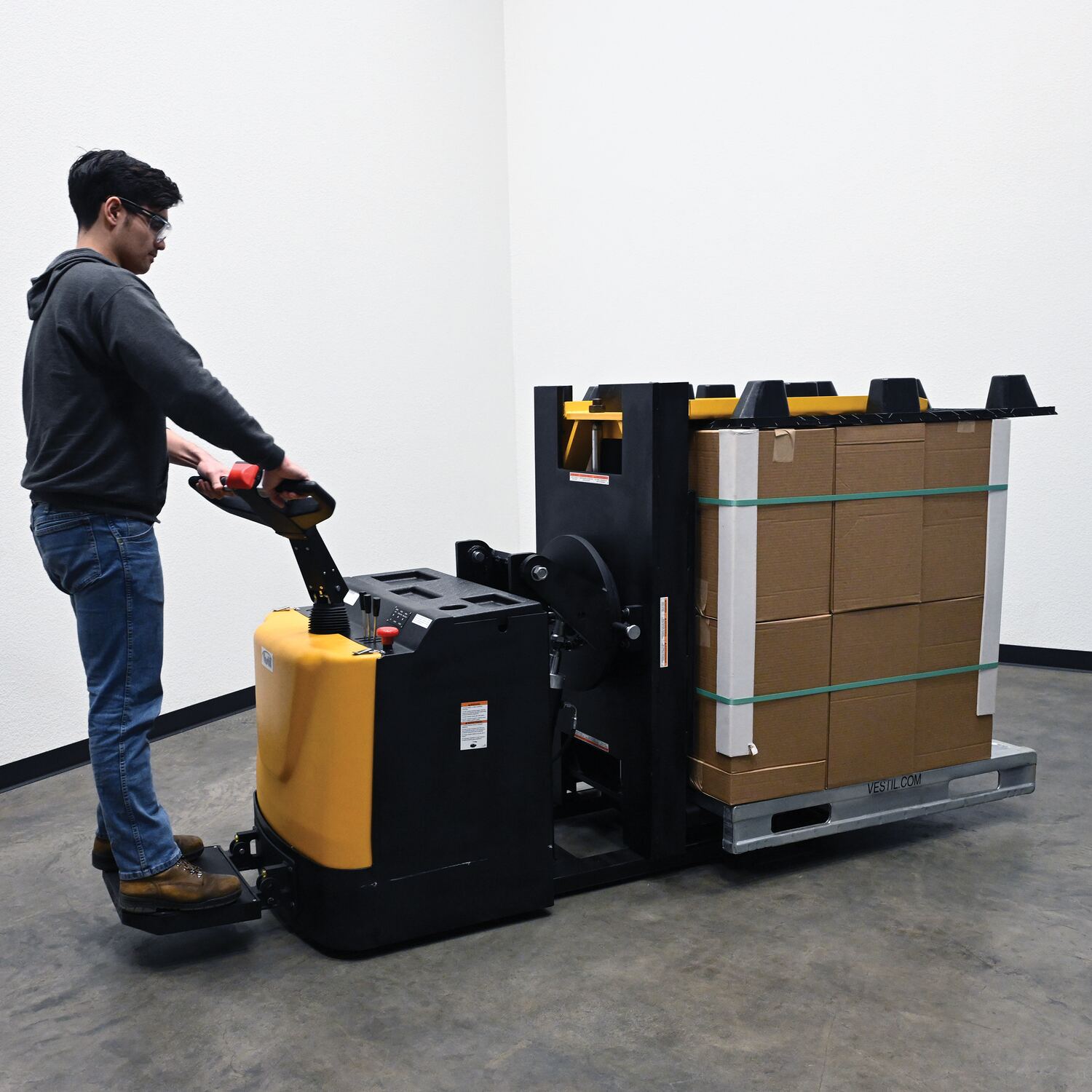 Tilt (powered) and rotate (manual) loads with our durable Pallet Inverter. Low profile design allows the operator to stand on the rider platform and steer the load from workstation to workstation quickly and easily. DC power lift and drive makes operation safe and efficient. The ergonomic handle features easy to operate throttle with infinite forward and reverse speeds, tilt/lower controls, safety belly reverse button, and horn. Features an electromagnetic disc brake with automatic dead-man feature that activates when user releases handle. Includes (4) 6V batteries, an on-board battery charger, battery level gauge, emergency battery disconnect, and horn. Ideal in loading dock areas as a powered pallet truck, powered pallet tilter, or as a manual turntable. Rolls smoothly on polyurethane steer and load wheels.