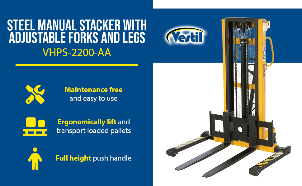 | Steel Manual Stacker Adjustable Forks/Legs 2,200 Lb. Capacity Black | Uniform Capacity (lb.): 2,200 Service Range (in.): 1.375 to 98.5 | 972 |