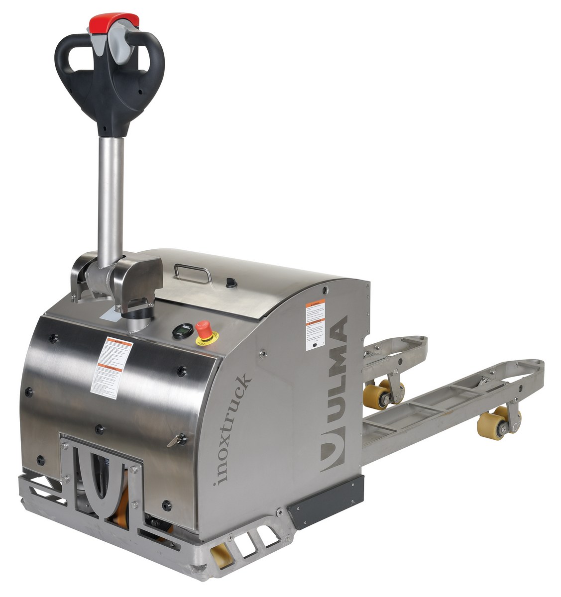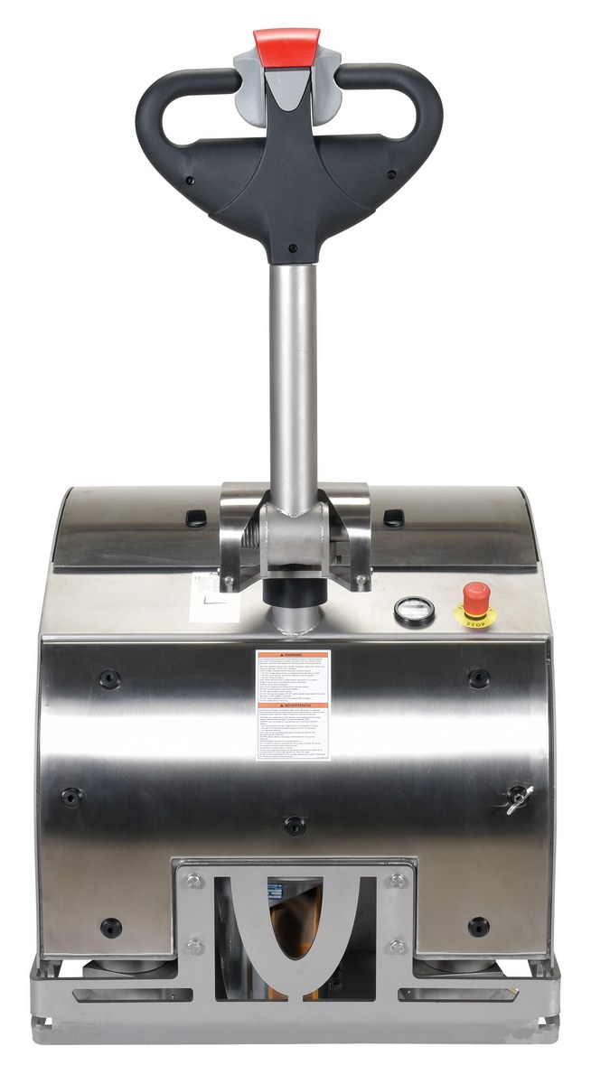The 304L Stainless Steel Electric Pallet Truck is an ideal supplement to food service and other sterile settings. The 304L stainless steel construction including hydraulic cylinders as well as the piston provides not only a strong structure for transferring heavy loads between work areas, but is also easily washable. An enclosed shelter for electronic components that is simple to access for general upkeep, while the humidity resistant electronics are great for working in difficult conditions. The adjustable height handle with built in horn helps maintain an ergonomic posture of the user during use. The emergency stop is perfectly located near the driving position of the unit for a rapid shut-down in the case of a crisis. During use the unit maneuvers efficiently on its waterproof roll wheels. Unit comes standard in 304 Stainless Steel (316 Stainless Steel is an option, contact factory for pricing). Battery is 24V.