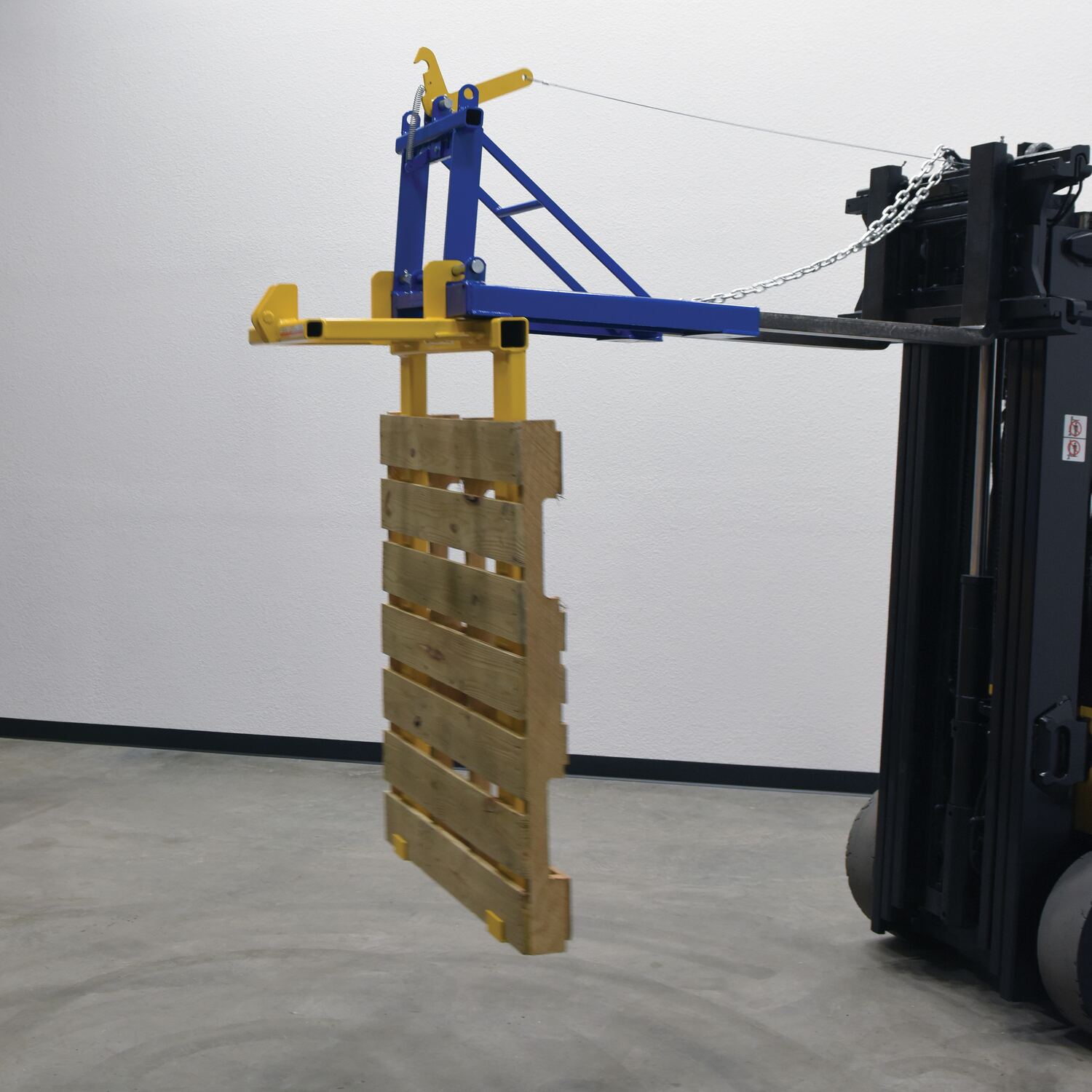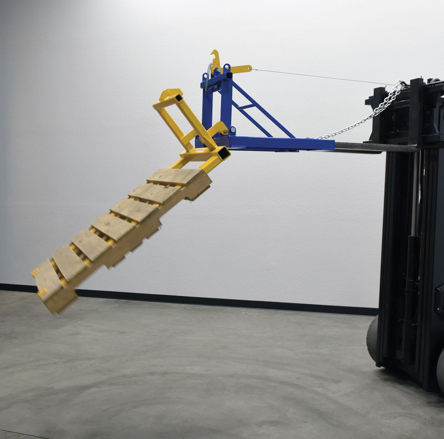Dump loaded pallets easily without leaving the seat of your fork truck with the all welded steel constructed Pallet Dumper. Unit fits to forks and is secured by a safety chain. Two retainers hold the pallet in place while dumping the contents into the hopper or dumpster. Once the retainers have cleared the opposite end of the pallet, raise the forks and the retainers will hold the pallet on the forks. Lift the pallet to the dumping height and rest the pallet on the edge of the dumpster. Pull the cable, releasing the fork carriage, allowing the pallet to tilt and dump the load into the hopper or dumpster. When finished, simply lower until the carriage latches.