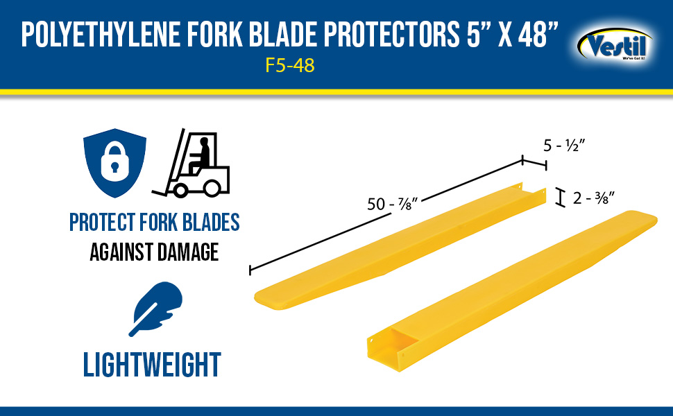 F5-48 F5-48Polyethylene Fork Blade Protectors 5 In. x 48 In. YellowUse with Fork Blades Width/Length/Height (in.): 5 x 48 x 2