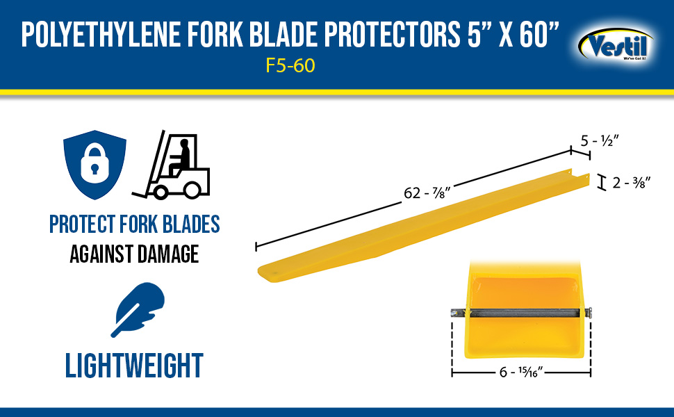 F5-60 F5-60Polyethylene Fork Blade Protectors 5 In. x 60 In. YellowUse with Fork Blades Width/Length/Height (in.): 5 x 60 x 2