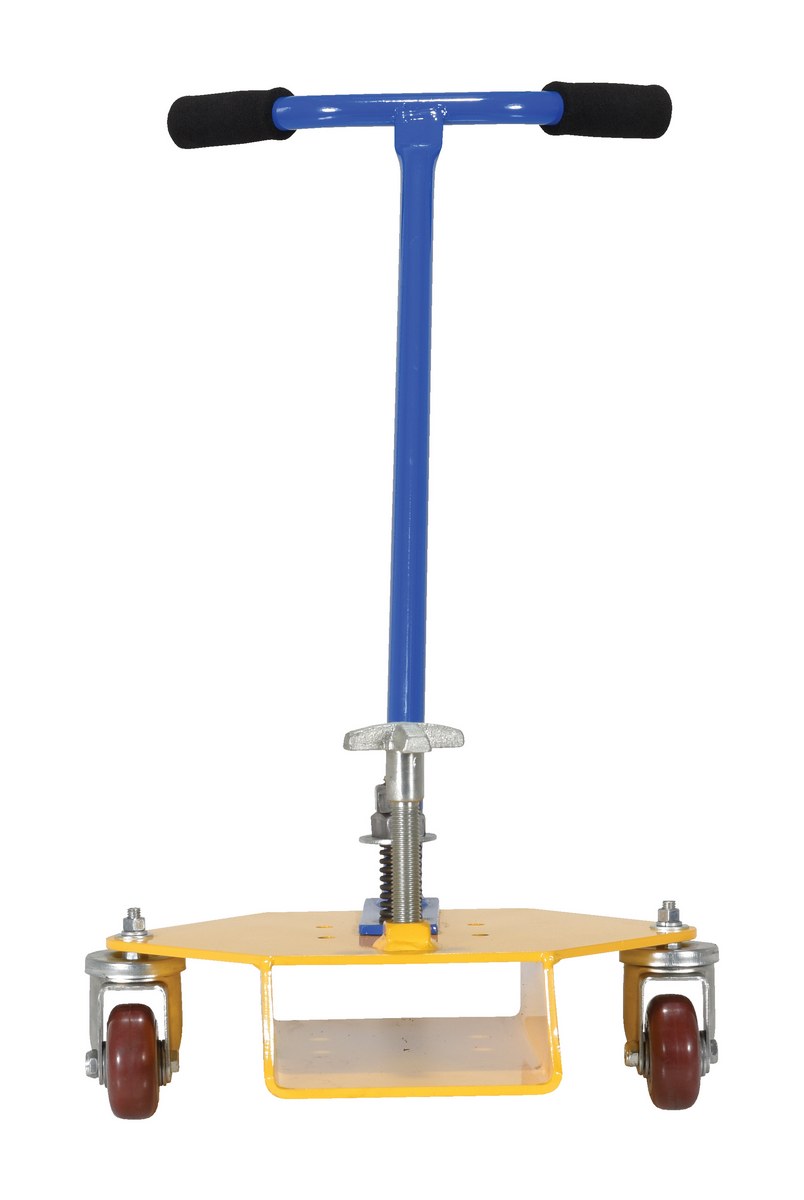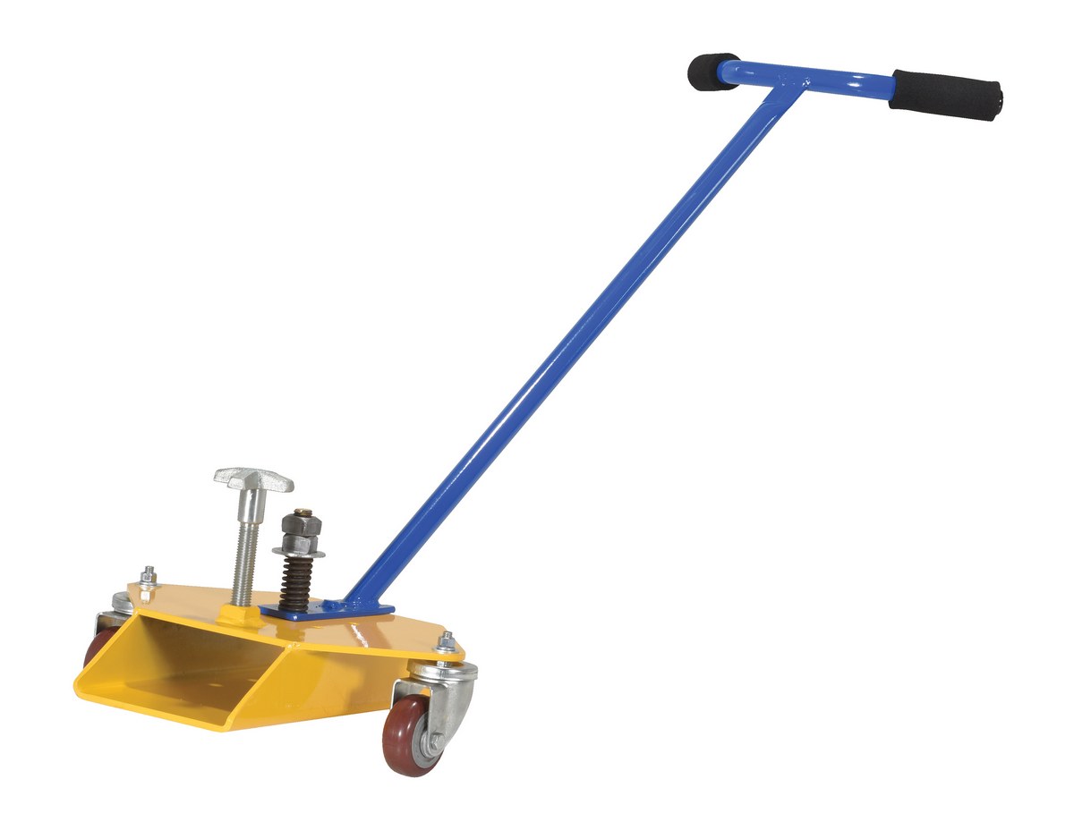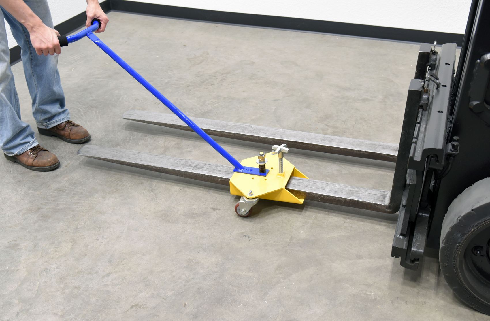 After transporting the fork to the forklift, rotate the handle 90 degrees then slide the fork onto the mast. The Fork Caddy has easy-grip handles and rolls smoothly on two swivel casters. A star knob secures the caddy onto the fork to keep it in place while transporting. The comfort-grip handle pivots up to 180 degrees to allow for easier mobility. The Fork Caddy is lightweight and small enough for easy storage as well.