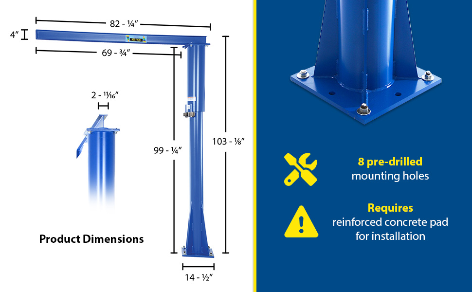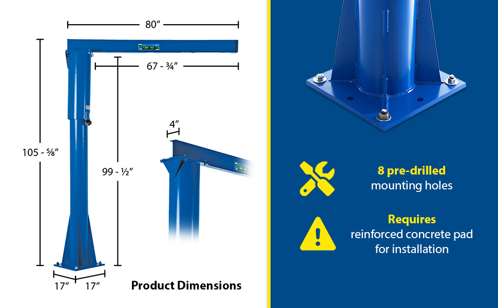This floor mounted jib adapts well to a variety of applications. With the unique design, the job is functional in any direction or complete customization of the work station. Solid steel construction will assist workers in lifting awkward material. The overall I-beam length is 80", except for model JIB-FM-40 which has an I-beam length of 80-3/8". Hoists & Trollies can be ordered seperately.