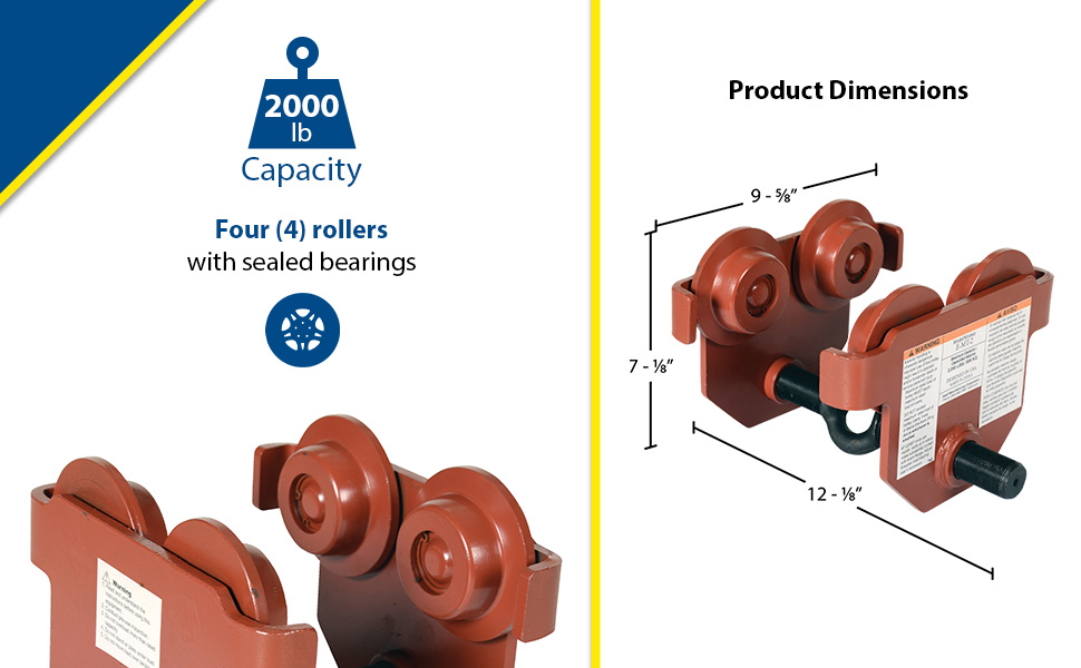 These trollies have been designed to quickly install on virtually any S, H,W, and M type I-beam. The width of the trolley is adjusted by rotating the center rod with lifting eye clockwise or counterclockwise. Once hoist (not included) is attached, center rod cannot be rotated which prevents trolley width from accidentally changing. Choose either push trolley or geared trolley. Geared trolley is ideal for use when precise positioning of the trolley is required. The trolley includes four rollers with sealed bearings for long life. A lifting eye is located at the bottom of the trolley for attaching a hoist (not included). Steel construction and painted finish. Headroom is measured from the bottom of wheel to bottom of hooking eye.