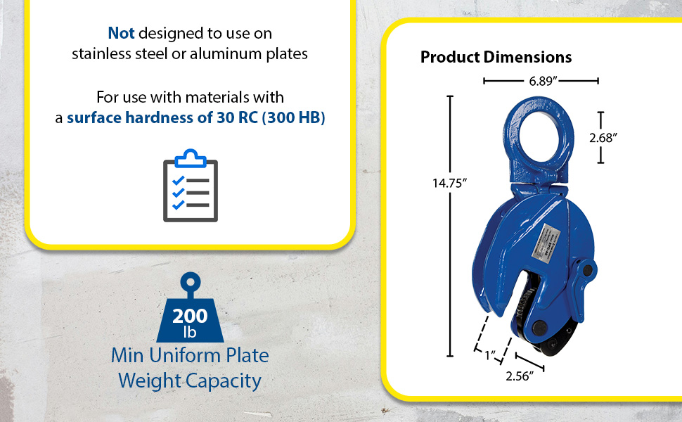 Pivoting bale for easier and more versatile operation. Automatic serrated hardened steel cams and pads. Drop-forged steel case for maximum strength. Designed to meet ASME B30.20. Warning: Do not exceed the working load limit. Serious bodily injury or property damage may result. Do not use plate clamps to lift loads less than 20% of rated capacity. Lift only one plate at a time. Plate must be clean and free of oil. Not designed to use on stainless steel or aluminum plates. For use with materials with a surface hardness of 30 RC (300 HB).
