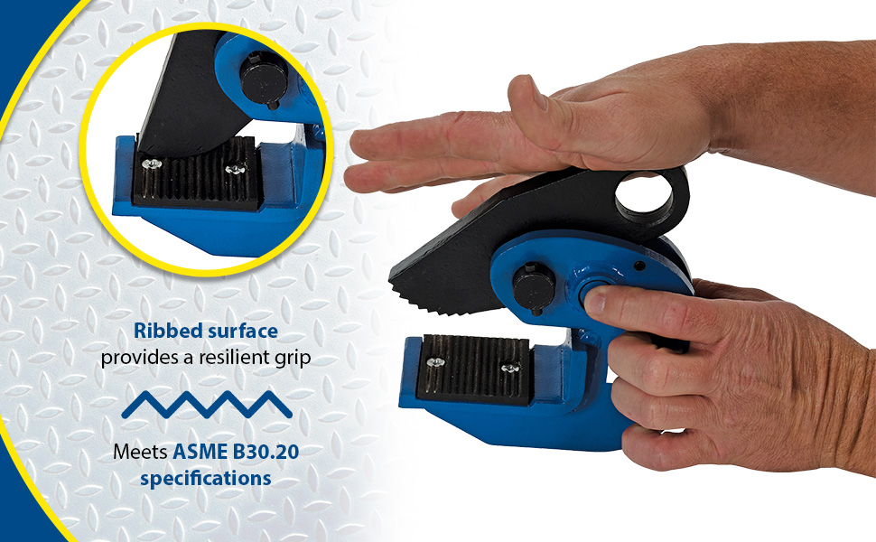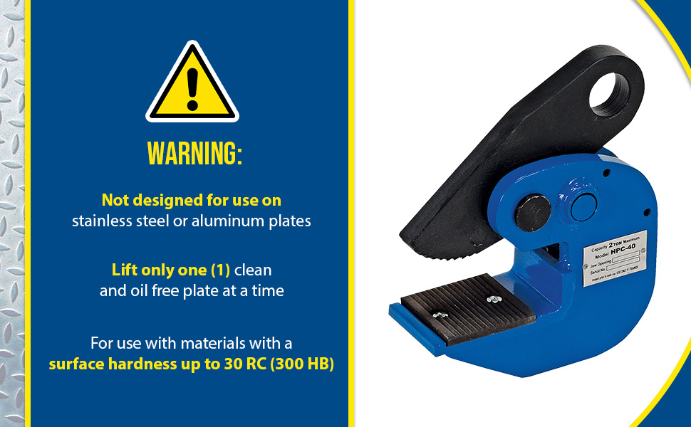 Clamp is perfectly designed for lifting plate material in horizontal positions. Heavy-duty steel construction for years of reliable use. Not designed for use on stainless steel or aluminum plates.