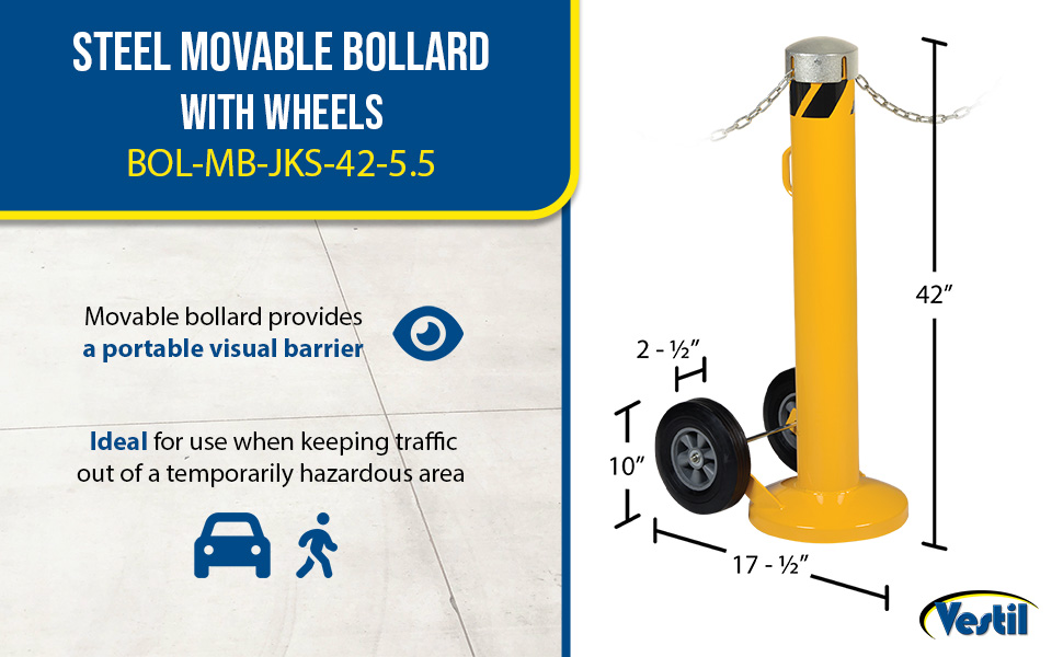 Movable Bollards provide a portable visual barrier when an area needs temporary protection. Ideal for use when keeping traffic out of a temporarily hazardous area or area under repair. Can be used indoors or outdoors. Units are 42" high with a diameter of 5-1/2". 10" moldon-rubber wheels standard. Yellow baked-in powder-coated toughness for high visibility. Series BOL-MB-JK has a removable plastic top cap, which exposes four chain slots. Series BOL-MB-JKS has a removable bolt-on steel top cap with socket set-screw.