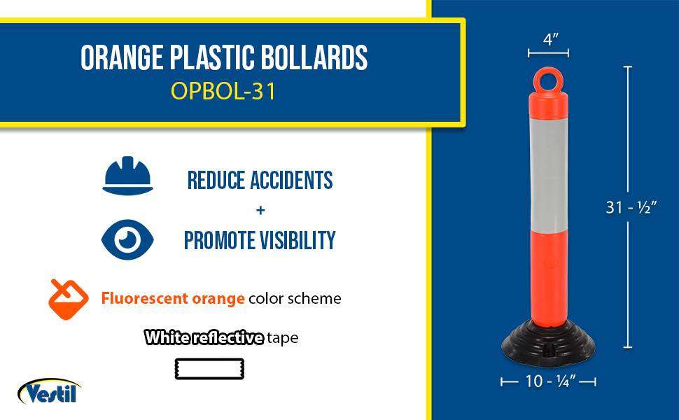 Orange Plastic Bollards are engineered for safety and the reduction of accidents. A fluorescent orange color scheme with white reflective tape promotes safety and visibility. A loop located at the top of the unit enables easy handling and is ideal for any workplace. Spring loaded for forgiveness when contact by an outside force. Base has 3 holes for mounting to surface. Hardware for mounting base is not included.