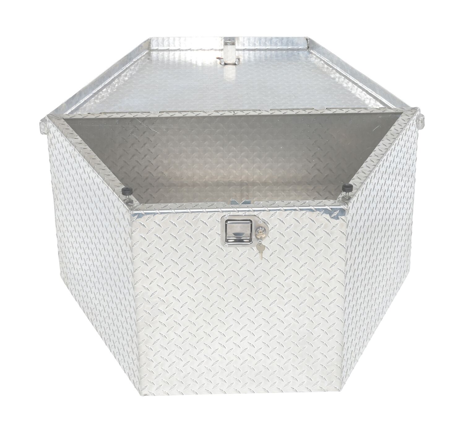 This toolbox is specifically designed to be used on the tongue of fifth wheel trailers. So often this space is never utilized fully or all together wasted. With this specifically in mind, this toolbox is built to fit directly into that empty fifth wheel space. A narrow front end with a wide back allows the user to secure a large variety of items and protect them from the outside elements.