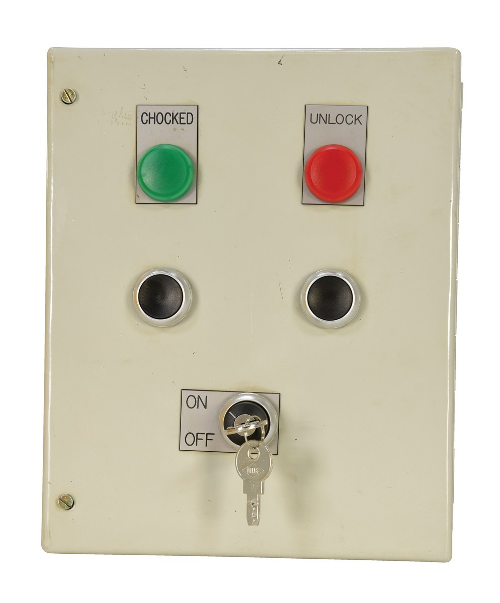 With an empty dock, the DTS-10 lights are green outside and the red inside. Once a truck driver has chocked the trailer's wheels the driver presses the outside "CHOCKED" button, which flips the outside light red and the inside light green. If the truck driver fails to press the outside button, the dock attendant can press the "CHOCKED" button at the inside control panel, if it has been affirmed that the trailer wheels are chocked. (OSHA Standard 1910.178 sections (k)(1) and (m)(7) requires that wheel chocks be placed under the rear wheels of a truck.) Once the trailer has been loaded/unloaded, the dock attendant presses the "DEPART" button to indicate that it is okay for the truck driver to remove the chocks from in front of the trailer wheels and pull away from the dock. Pressing the "DEPART" button causes the lights to turn green outside and red inside.