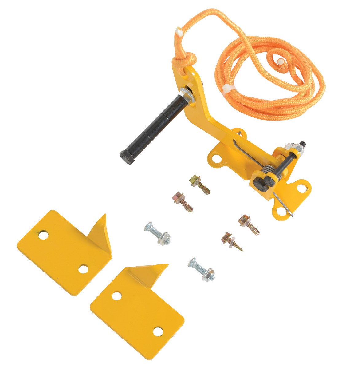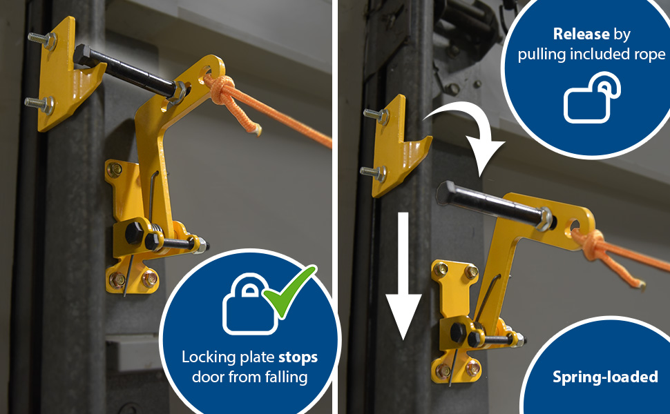 Unique product will allow overhead doors to be locked in virtually any up position. Automatically locks doors in full up position or in the closed position. Prevents the overhead door from unexpectedly "slamming down". Protects personnel, product, and equipment. Spring-loaded locking latch is released by pulling rope (included). Simply bolts to any overhead door (installation hardware is not included). Includes two reversible "locking plates" that may be mounted anywhere along door track. Steel construction with yellow baked in powder coated toughness.