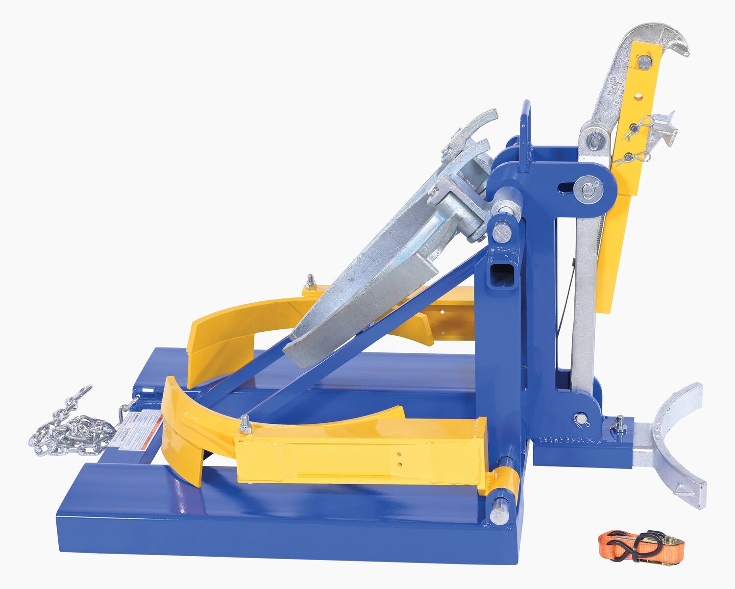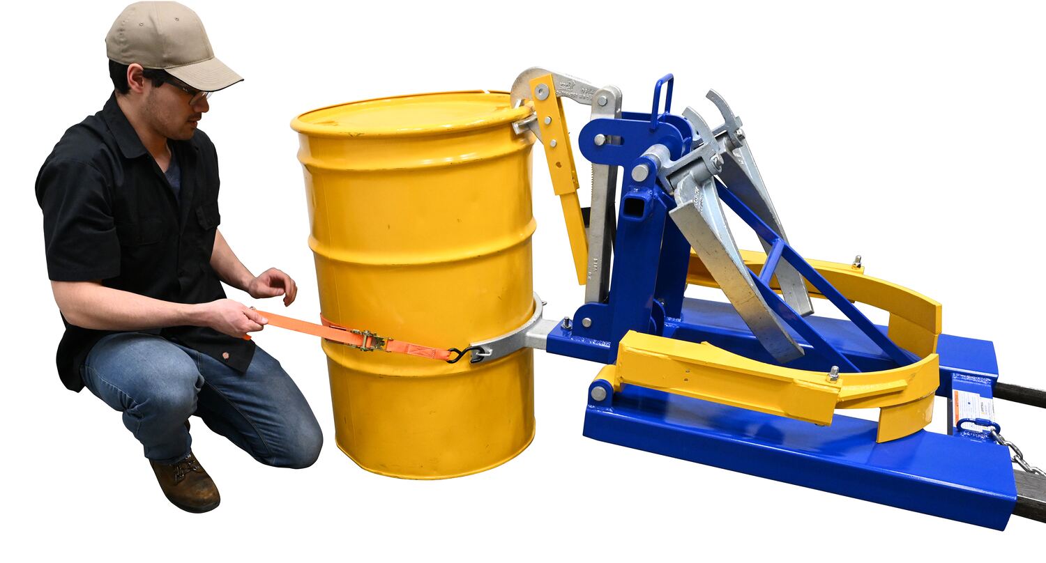 DFDL-3 360Deluxe Combination Fork Mounted Drum Lifter includes attachments to lift any type of drum; 30 and 55-gallon, steel, plastic, fiber, and open or closed head drums. Includes single Eagle Beak unit and both bottom and top lip Poly Drum Lifters. Uniform capacity will vary depending on which attachment you use. The usable fork pockets are 7-1/2" wde by 2-1/2" high on 20-1/2" centers. Includes safety restraint for securing unit to fork truck. Welded steel construction. Powder coat finish. A ratchet strap is supplied to secure the drum to the unit when traveling over rough terrain.