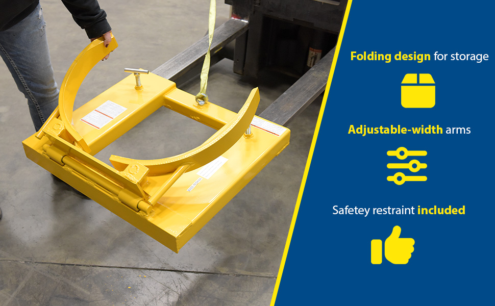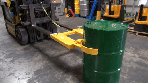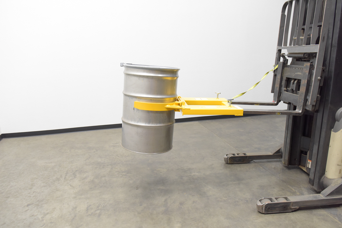 The Drum Gripper makes it easy to pick up one or two open head (with lid installed and secured) and closed head steel drums without leaving the seat of the fork truck. Simply slip the forks into the fork tubes, fasten the safety restraint and the Drum Gripper is ready to go. The knuckle gripping system is lowered around the drum, gripped tightly, and then lifted into the air. Drum is automatically released by lowering the forks. All models feature hinged folding design for storage. Safety restraint included. Welded steel construction with a baked-in powder-coated toughness.