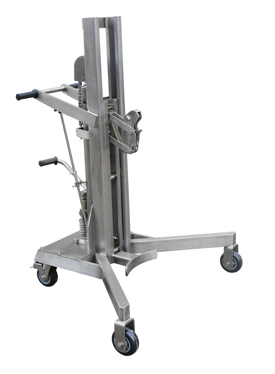 The Stainless steel hydraulic drum lifter is designed to allow the operator to load or unload drums on and off the corner of pallets. Straddle leg design allows the drum lifter to glide over standard pallets and grab most 30, 55, or 85 gallon steel and poly drums. Drums are raised and lowered easily using the foot pump. 304 grade all stainless steel construction. Ideal for washdown, pharmaceutical, and clean room applications. Highly maneuverable on two (2) rigid and two (2) swivel with brake nylon wheels. Cannot be used with fiber drums.