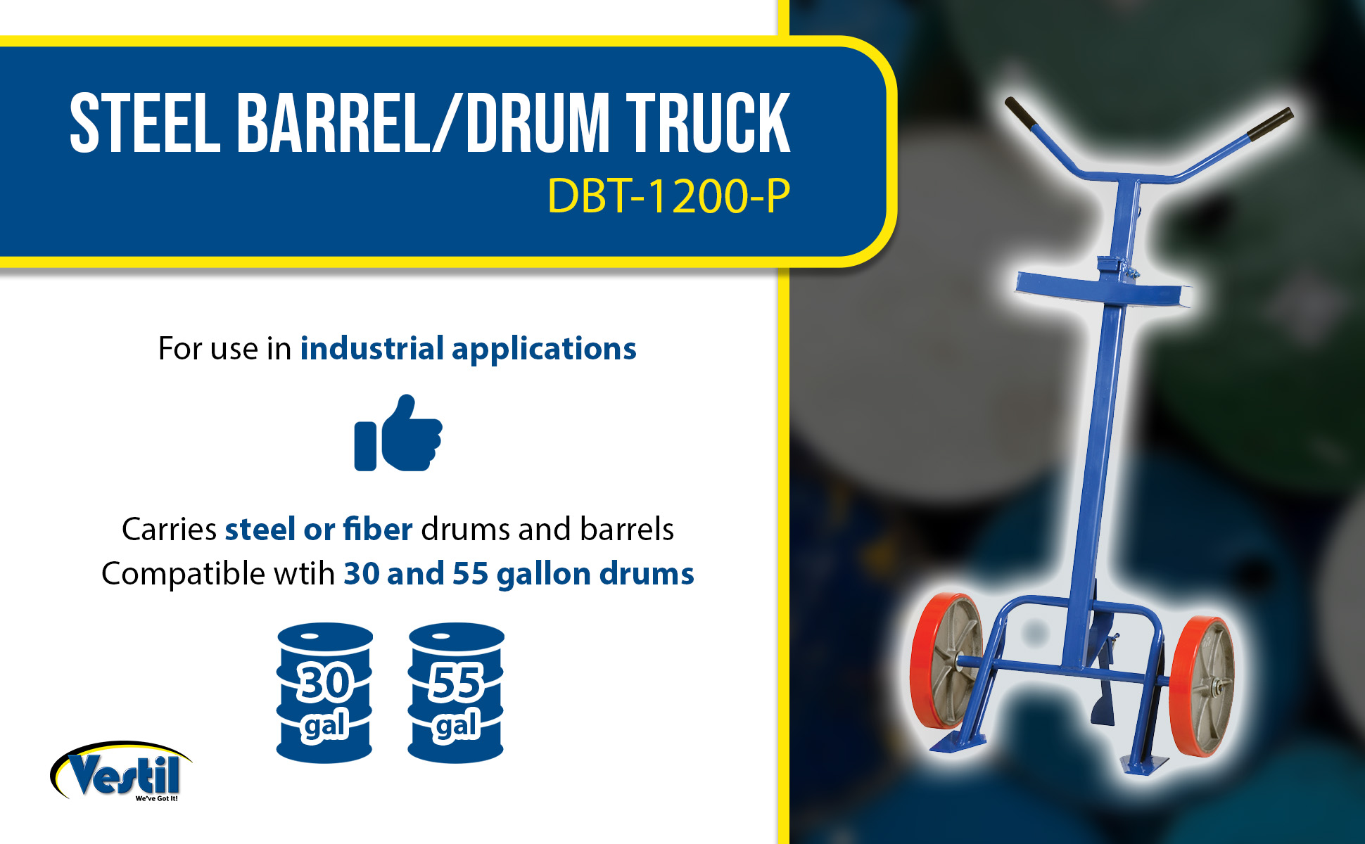 DBT-1200-P DBT-1200-PSteel Barrel/Drum Truck with Poly On Steel Wheels 20-1/4 In. x 29 In. x 60 In. 800 Lb. Capacity BlueUniform Capacity (lb.): 800