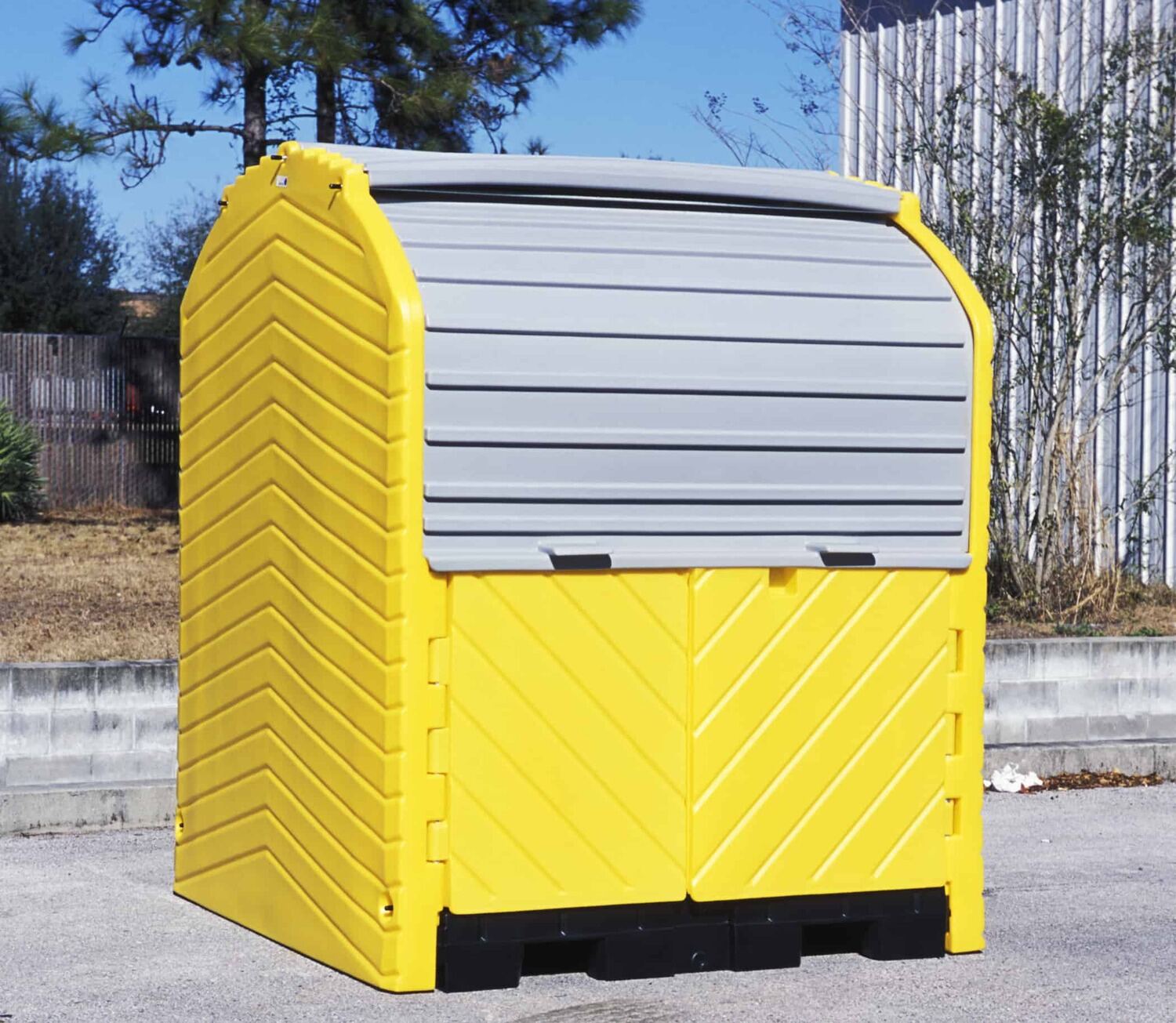 When keeping hazard and waste materials secure and out of the elements is a must, look no further than the hard-top drum storage container! A UV inhibited polyethylene construction provides a dense barrier between the contents and those unrelenting weather conditions. With a simple roll top cover and hinged doors, entrance and exit of personnel and material is without restriction. A large capacity spill pallet with drain is included for catching excess spills and leaks. Built-in fork pockets allow for a quick and easy movement between job sites! Meets EPA and Uniform Fire Code Spill Containment Regulations.