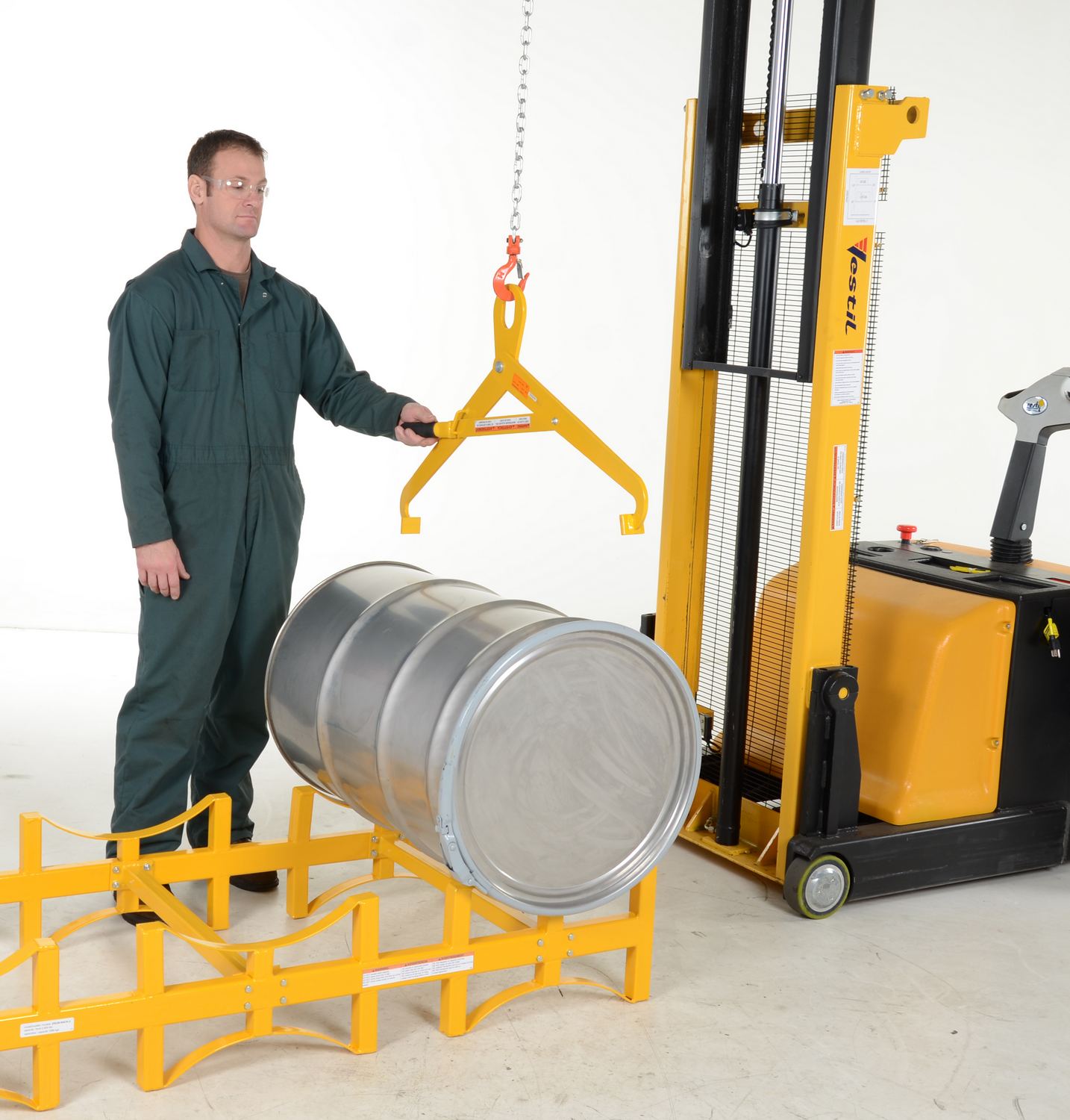 Made to lift 55 gallon steel or fiber drums with an overhead hoist. Suitable for open top or tight head steel drum which have a ring. To operate set locking lever in locked open position. When central over the horizontal drum release lever to allow hooks to fall and locate under both rims. Hook automatically engage as it is lifted and disengage as drum is set down.