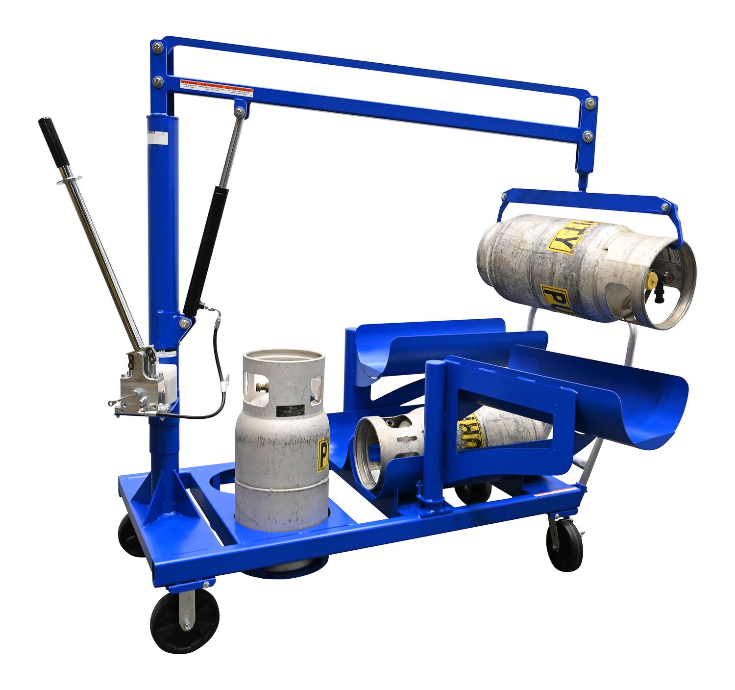 LP-6Finally an easy answer to lifting, storing, and transporting problems associated with LP tanks. The built-in crane can be used to safely load full tanks into fork trucks. The crane pivots 360 degrees for maximum versatility. The crane boom is raised and lowered with a manual hydraulic hand pump. The tank attachment at the end of the boom automatically clamps to each end of the cylinder. The built-in racks are ideal for LP tank storage-racks. Store two (2) tanks in the vertical position and four (4) tanks in the horizontal position. Unit includes a push handle with two (2) rigid and two (2) swivel with brake casters for portability. Welded steel construction with a painted finish.