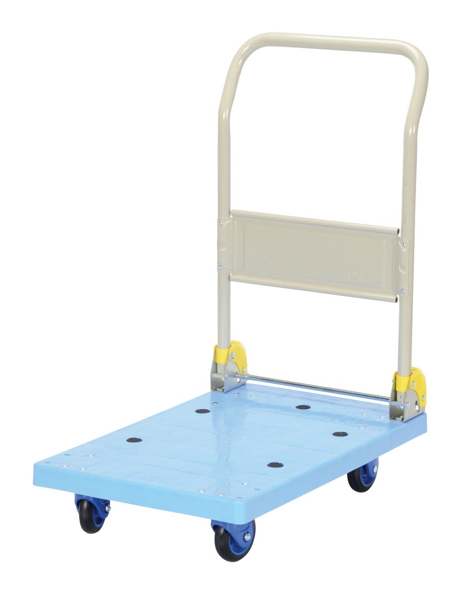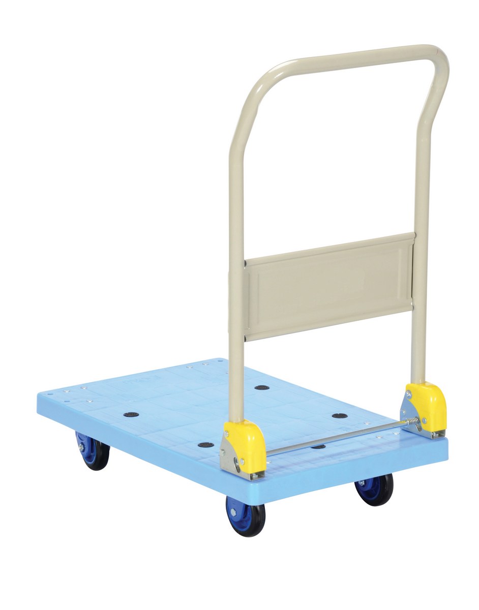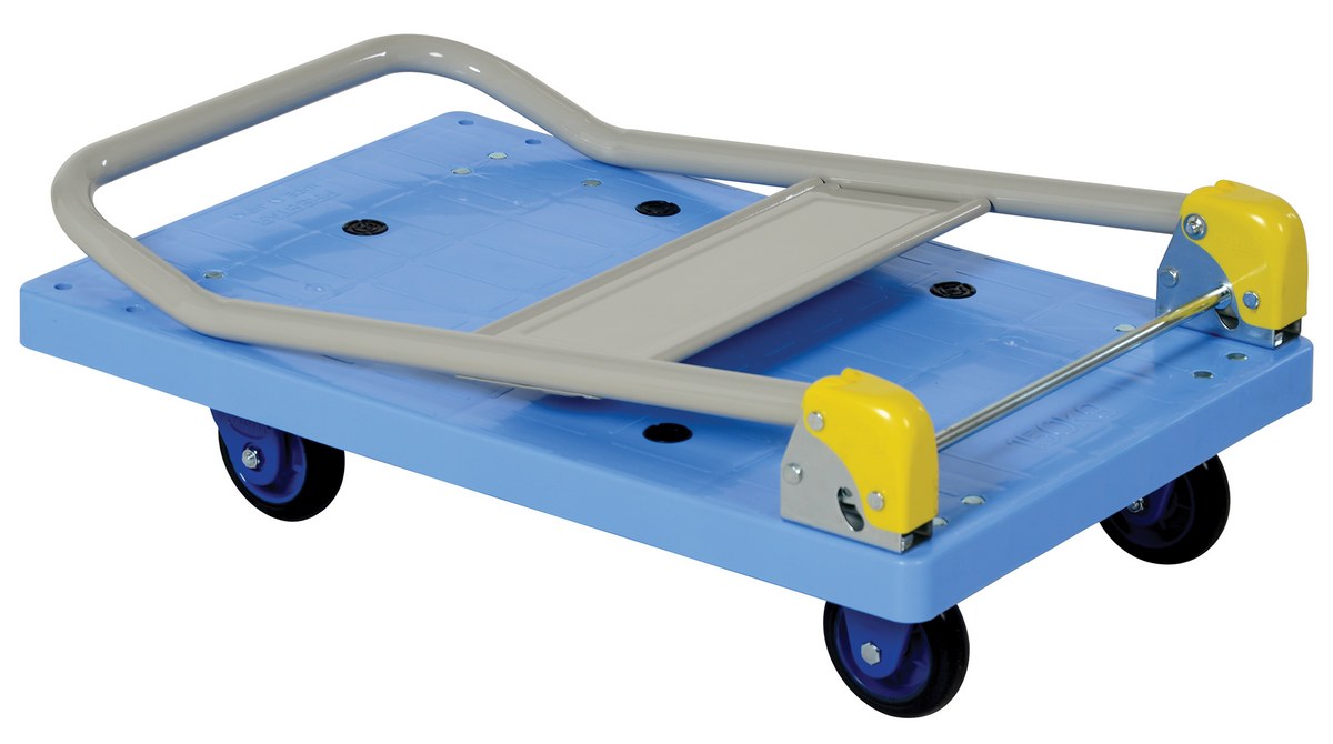 Light weight plastic platform trucks handle large loads, ideal for shops, schools, hospitals, supermarkets, warehouses and offices. Low start resistance to move the loads. 25-30% less force vs. conventional casters. Designed to move loads with less effort. High quality double bail bearings. Injection molded plastic platform with foldable handle for easy storage when not in use. Anti-skidding surface. Extra strong and durable platform. Foldable handle can be attached to opposite side to pull the cart. Handle double-finish painted. Safety protection covers on handle hinges.