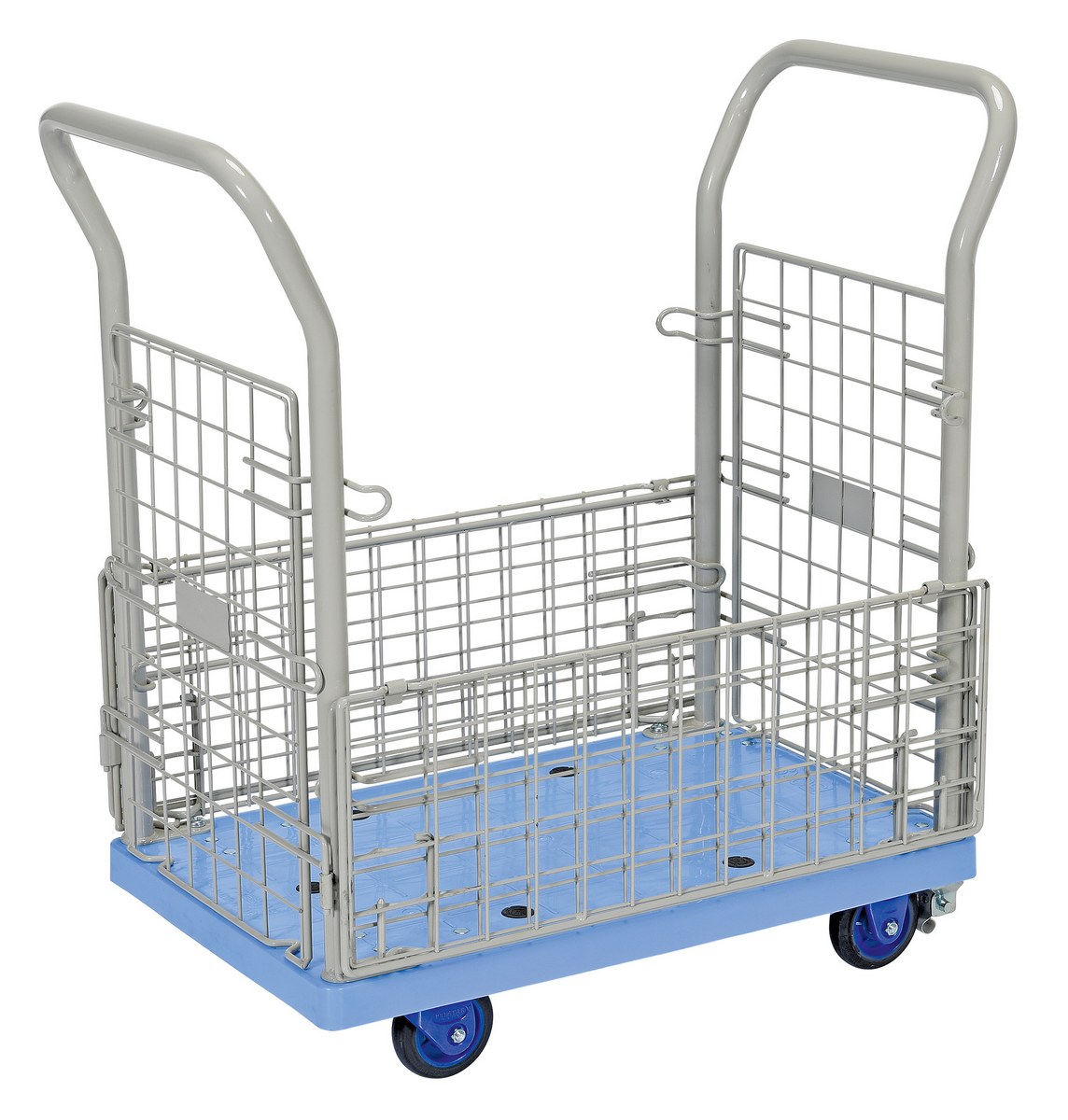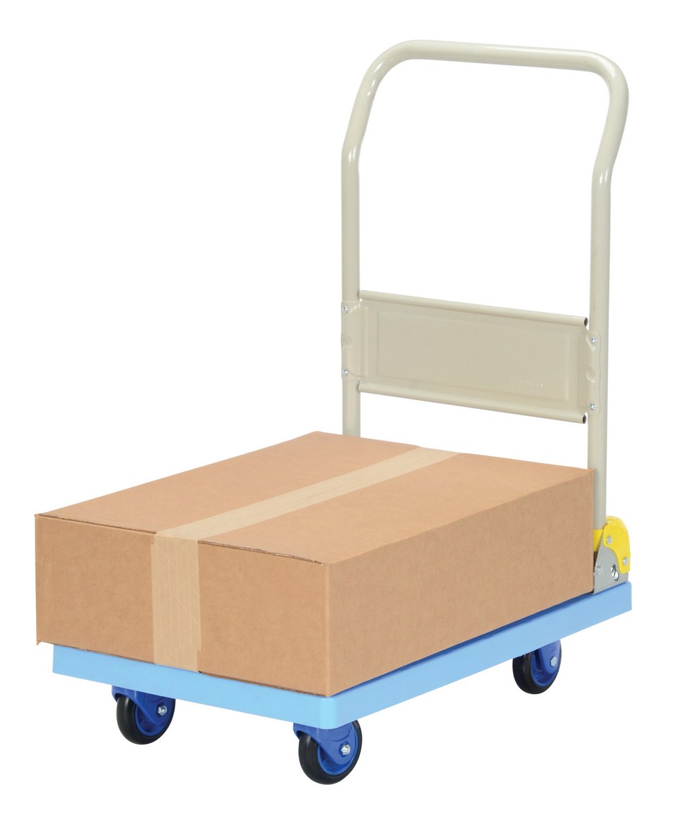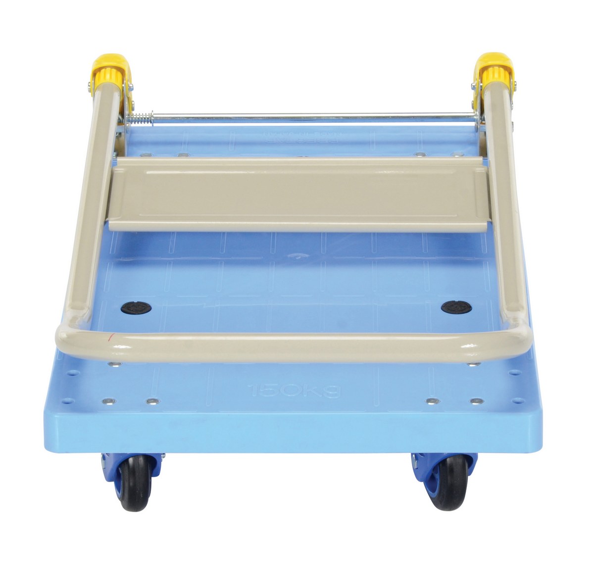 Light weight plastic platform trucks handle large loads, ideal for shops, schools, hospitals, supermarkets, warehouses and offices. Low start resistance to move the loads. 25-30% less force vs. conventional casters. Designed to move loads with less effort. High quality double bail bearings. Injection molded plastic platform with foldable handle for easy storage when not in use. Anti-skidding surface. Extra strong and durable platform. Foldable handle can be attached to opposite side to pull the cart. Handle double-finish painted. Safety protection covers on handle hinges.