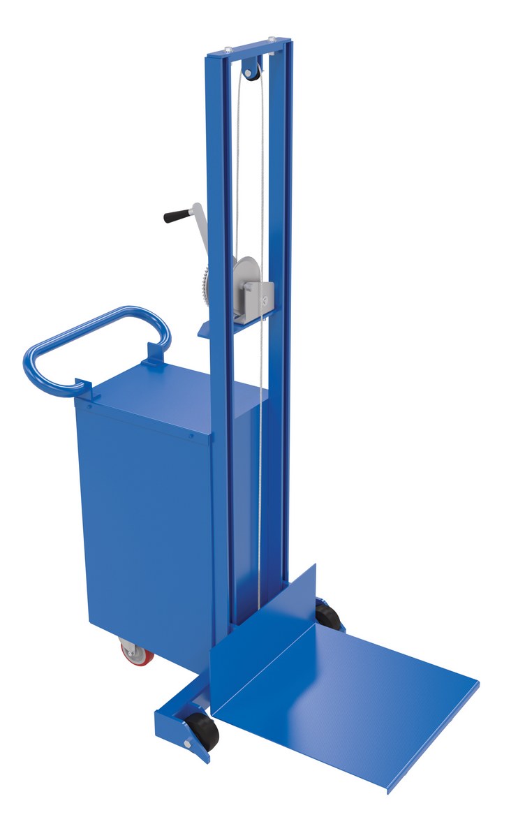 The Lite load lift is ideal for lifting and transporting loads from delivery trucks to docks, or use to inventory storage systems because of the counter-balance design. This lift has an easy to operate hand winch with a steel construction. The unit rolls smoothly on front mold on rubber wheels, rear hard rubber swivel wheels and a foot operated floor lock.
