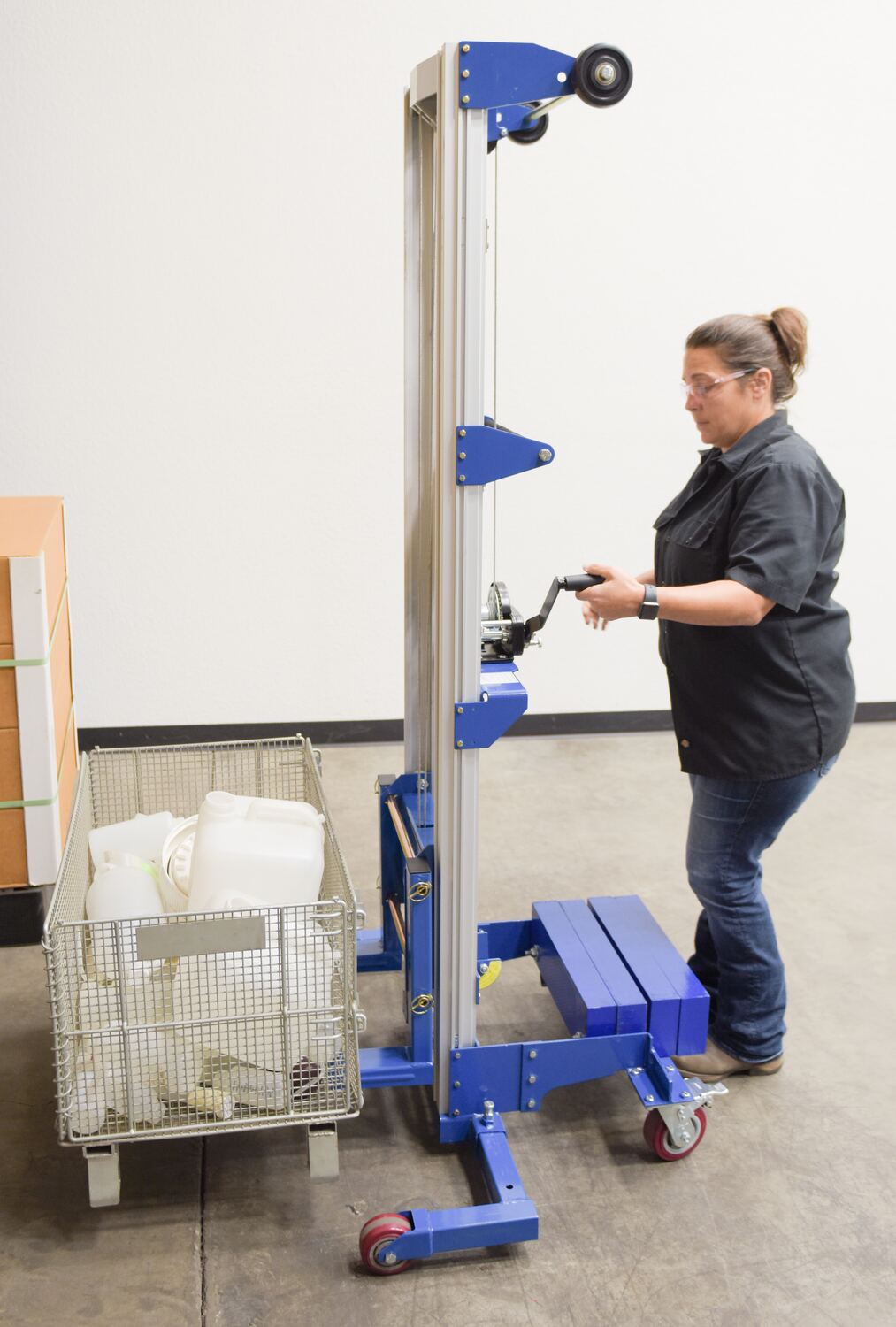 Aluminum/Steel Manual Hand Winch Lift Truck With Counter Balance 350 Lb. Capacity Silver/BlueThe hand winch lift truck is compact and designed to lift material to and from shelves, move office equipment, and install ceiling/wall appliances. It's constructed of durable steel-and-aluminum and a counterbalance design (counterweight included). Operated by a hand-crank winch that features a reversible handle and hold-down device for securing the carriage during transport. The non-adjustable forks can be inverted to provide different height ranges.