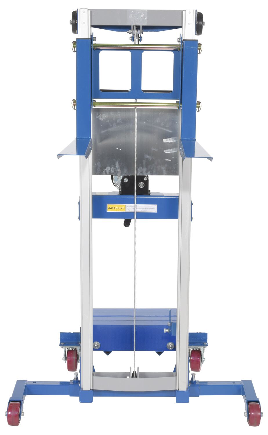 Aluminum/Steel Manual Hand Winch Lift Truck With Counter Balance 400 Lb. Capacity Silver/BlueThe hand winch lift truck is compact and designed to lift material to and from shelves, move office equipment, and install ceiling/wall appliances. It's constructed of durable steel-and-aluminum and a counterbalance design (counterweight included). Operated by a hand-crank winch that features a reversible handle and hold-down device for securing the carriage during transport. The non-adjustable forks can be inverted to provide different height ranges.