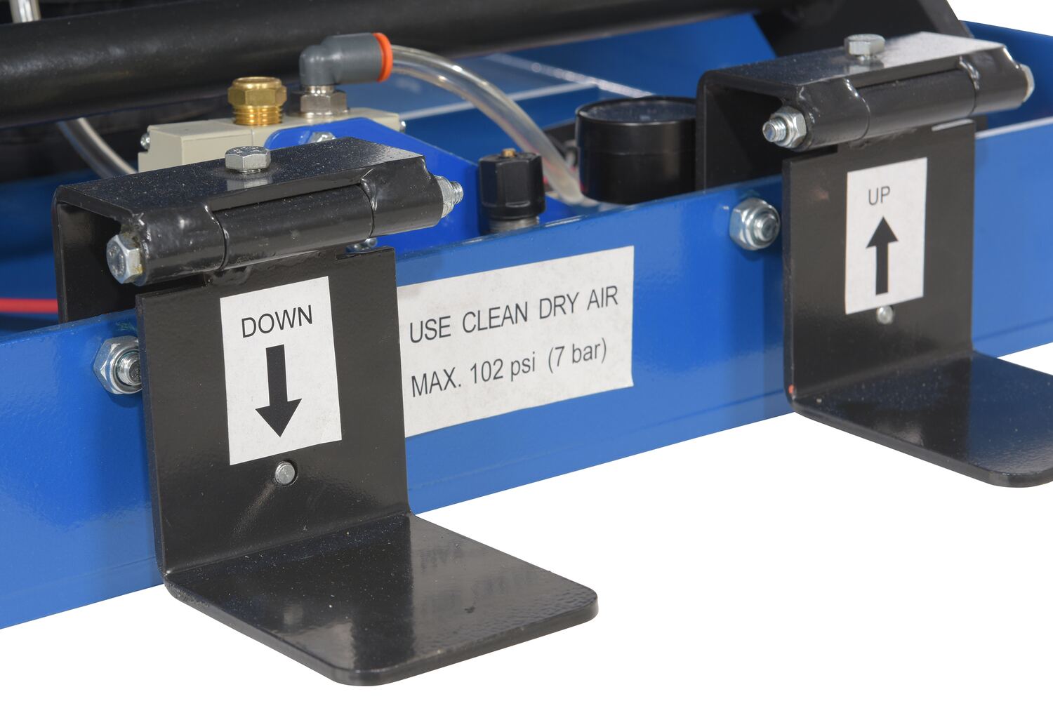 Steel Heavy-Duty Air Bag Scissor Lift Table 48 In. x 32 In. 1,000 Lb. Capacity BlueThe heavy-duty air bag scissor lift table uses factory air for clean, dependable, maintenance free operation. The safety features include a pressure relief valve, pinch point guard, and a standard foot control. The incoming air must be clean, dry, and regulated with a filter required. The standard features include an adjustable upper travel limit valve, state-of-the-art lifetime lubricated bearings, and maintenance prop.