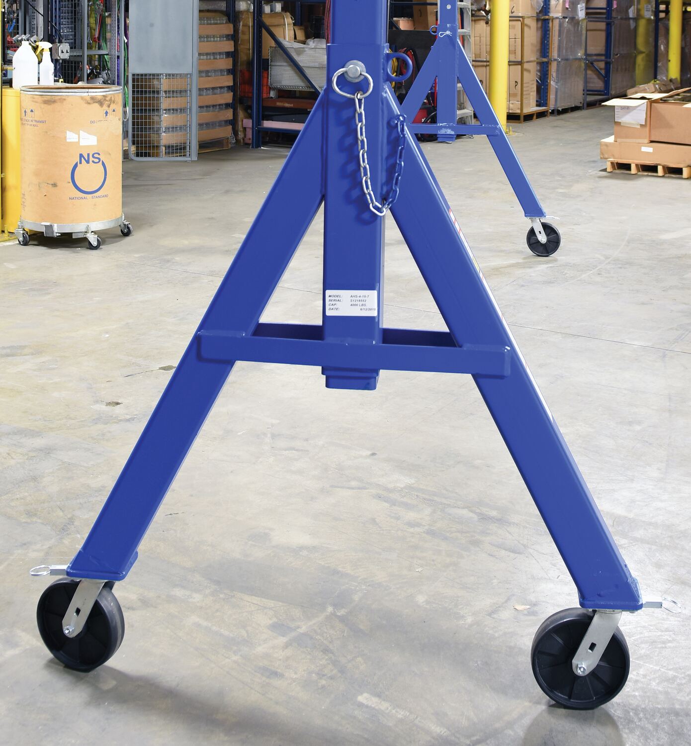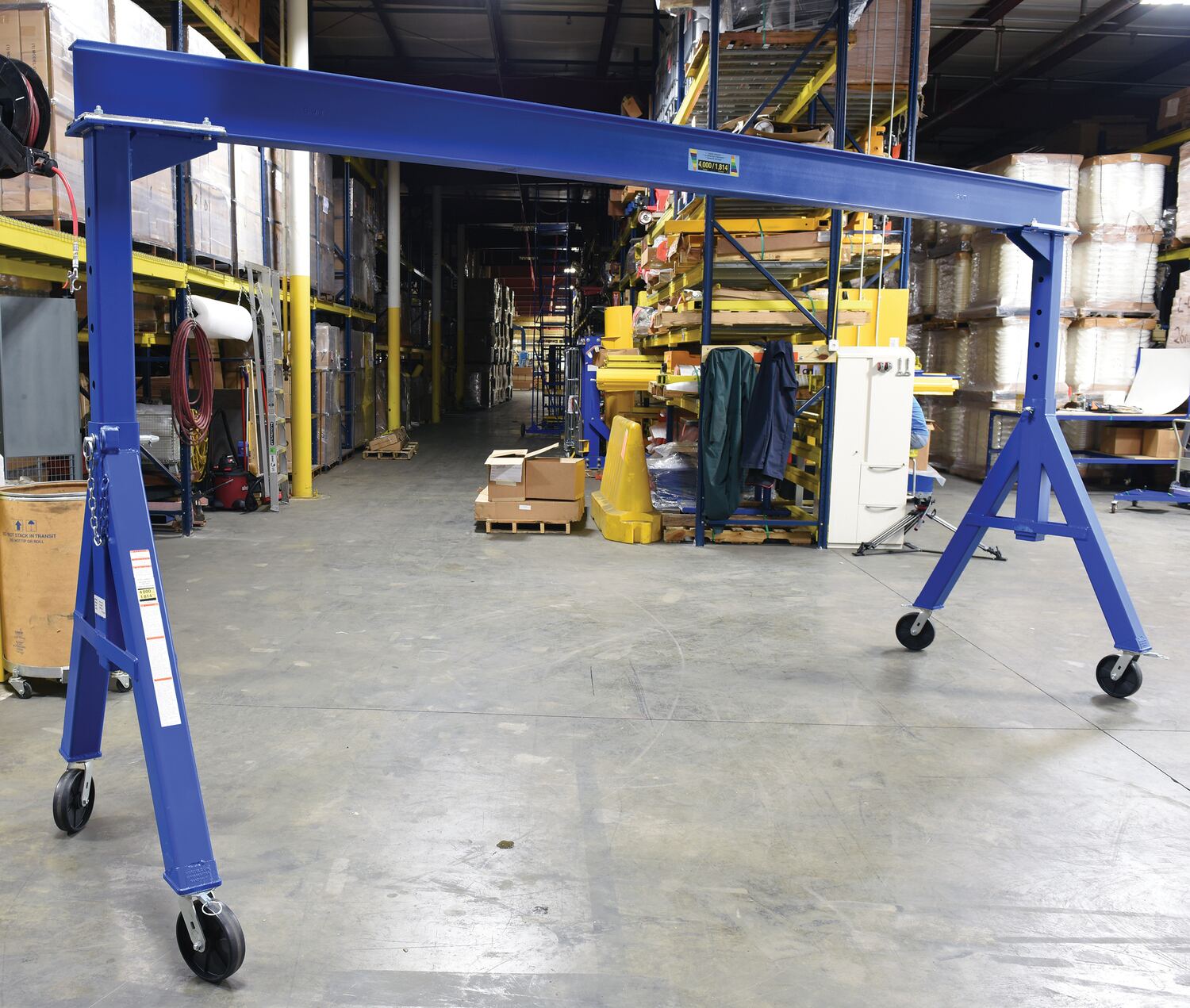 Steel Adjustable Height Gantry Crane with Phenolic Casters 15 Ft.Wide x 7 Ft. Max Usable Height 4,000 Lb. Capacity BlueThe industrial steel Gantry crane is designed for transporting and positioning materials along the beams length. The solid steel construction will provide years of service. Unit comes standard four (4) position locking swivel casters with roller bearings. Locks the rigging in 1 of 4 positions; you can set the wheels and push the gantry crane forward, back, left or right. There is an optional total locking casters that lock the rigging in any position and locks the wheel from rotating. More economical and flexible than permanent cranes and features a quick setup design. Painted blue finish with warning and operating stickers and complete owner's manual. Designed for semi-permanent or permanent applications. Requires assistance from fork truck to set-up.