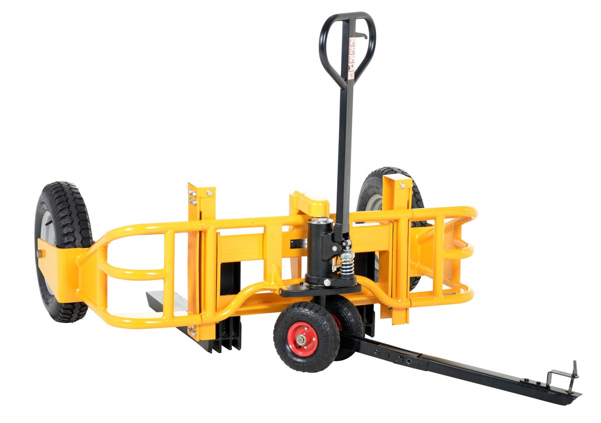 Optional tow bar Package allows the all terrain pallet truck to be towed by an ATV or small utility tractor. It's designed for pulling in either loaded or unloaded position. For storage purposes, a yellow nylon pulling strap is included.