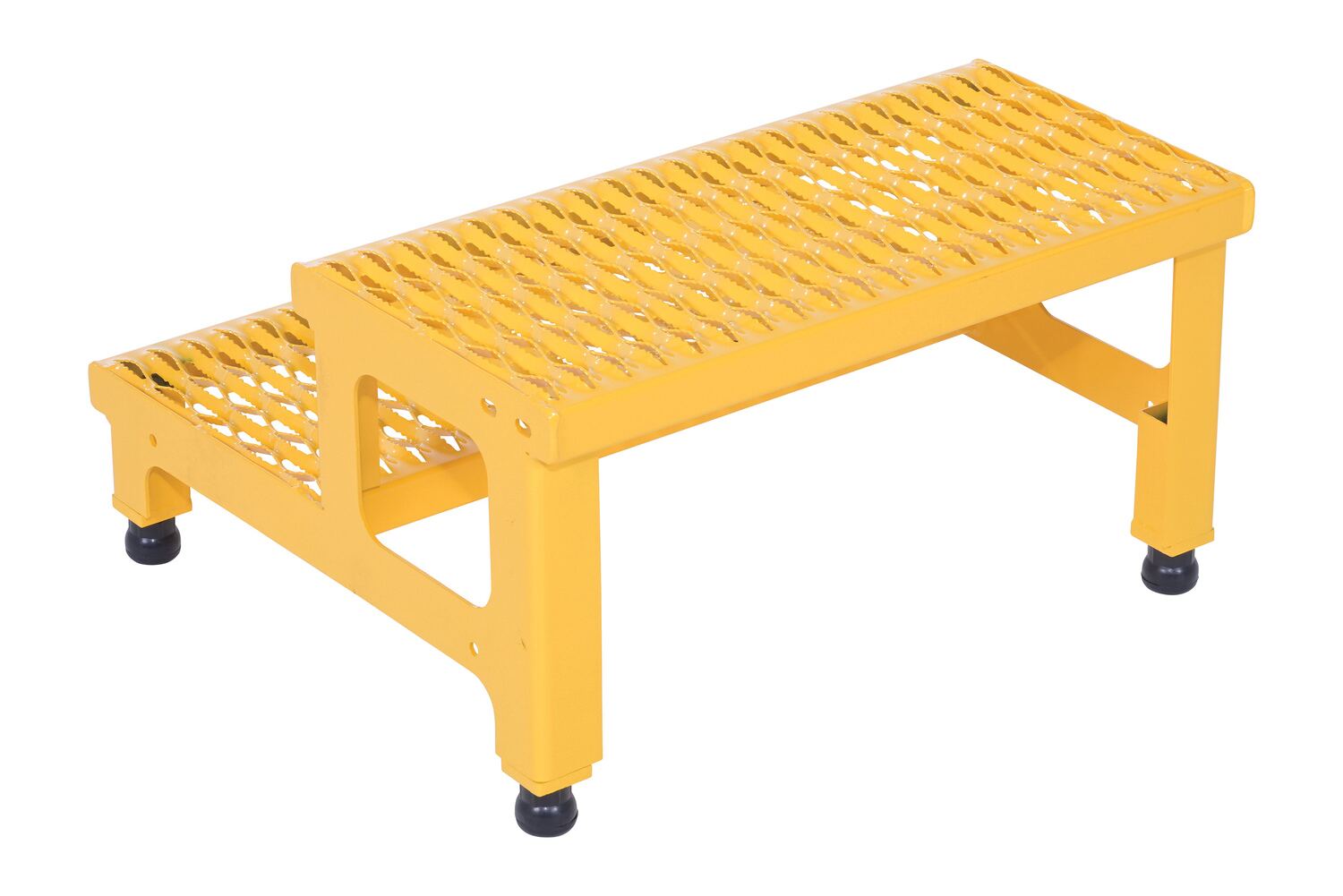 Steel Adjustable Step Mate Stand 2 Step 22-7/8 In. x 23-13/16 In. x 15-1/4 In. 500 Lb. Capacity YellowThe adjustable step-mate stand can be used as either a comfortable worker platform or a semi-permanent step. The serrated surface ensures safe footing. The legs adjust individually by screwing them into or out of the leg base.