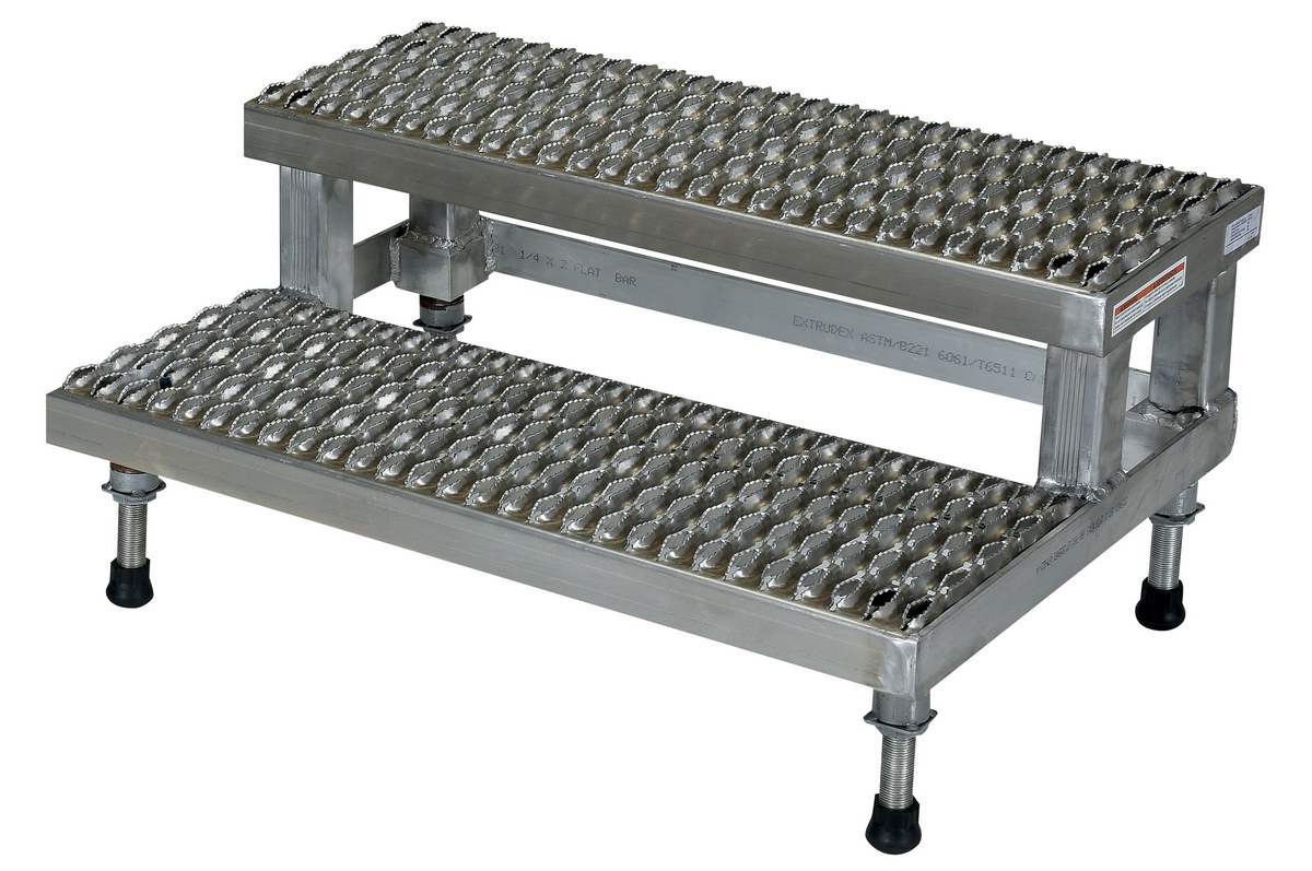 Aluminum Adjustable Step Mate Stand 2 Step 22-3/4 In. x 36-1/8 In. x 14-1/2 In. 500 Lb. Capacity SilverThe adjustable step-mate stand can be used as either a comfortable worker platform or a semi-permanent step. The serrated surface ensures safe footing. The legs adjust individually by screwing them into or out of the leg base.