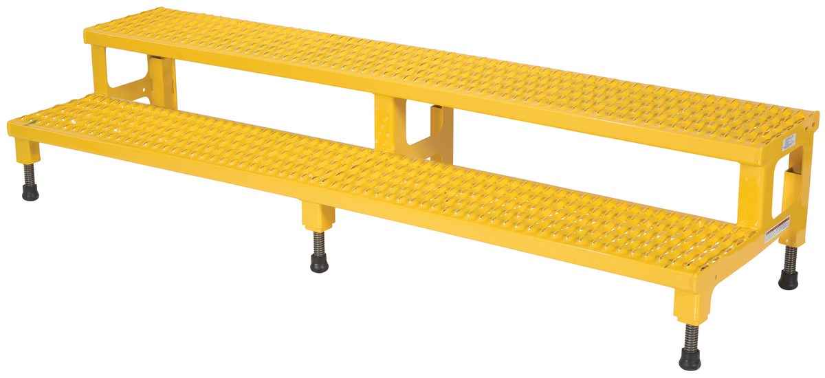 Steel Adjustable Step Mate Stand 2 Step 22-7/8 In. x 72-1/16 In. x 15-1/4 In. 500 Lb. Capacity YellowThe adjustable step-mate stand can be used as either a comfortable worker platform or a semi-permanent step. The serrated surface ensures safe footing. The legs adjust individually by screwing them into or out of the leg base.